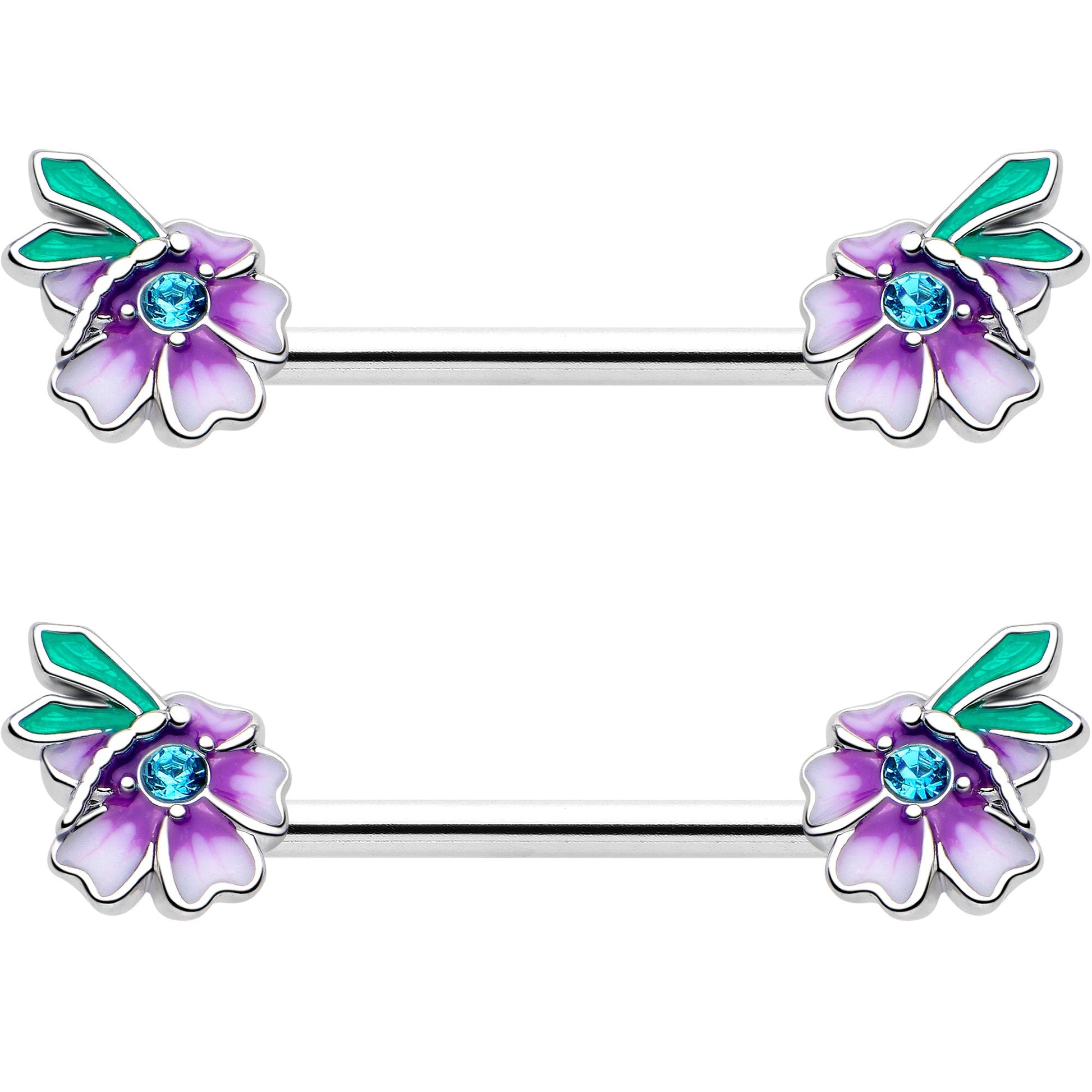 14 Gauge 9/16 Blue Gem Faerie Flower Purple Barbell Nipple Ring Set