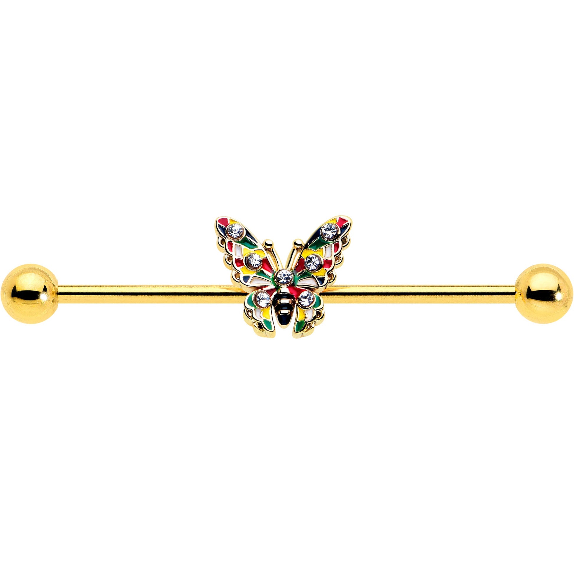 The butterfly on this 14 gauge helix barbell is rocking all the color and style you could possibly want. It's made with a 1 1/2 inch gold tone PVD over 316L surgical grade stainless steel straight barbell with 5mm ball ends. It features a butterfly charm. The butterfly has wings inlaid in shades of red, yellow, and green with color block styled detailing. It is further embellished with clear gems and you can slide it up and down the length of the barbell for the perfect look. Grab your paintbrush and spread your wings, it is time for colorful style with this beautiful butterfly barbell earring.Specifications
