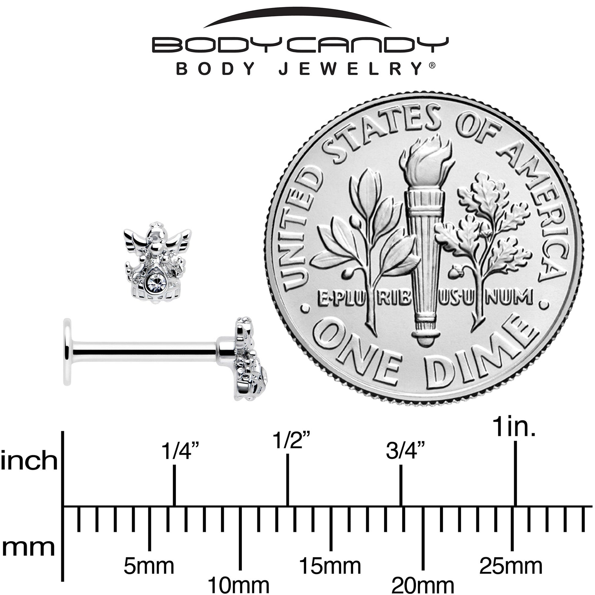 Get a heavenly look with this ethereal 16 gauge lip ring. It's made with an 8mm durable 316L surgical grade stainless steel straight post with a flat disc end. It features an angel charm with intricate detailing and is further embellished with clear cubic zirconia gems for added glamour. You can even rock it in multiple piercings including labret, monroe, tragus, helix, and some conch piercings. You'll be in heaven when you're rocking this heavenly cartilage piercing jewelry.Specifications