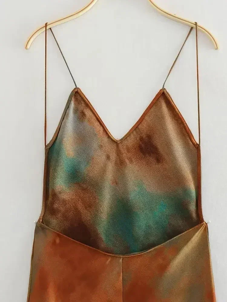 2025 Summer New Women's Open Back Sleeveless Dress Fashion Satin Mid Length Dress Printed Sexy V Neck Sling Dress