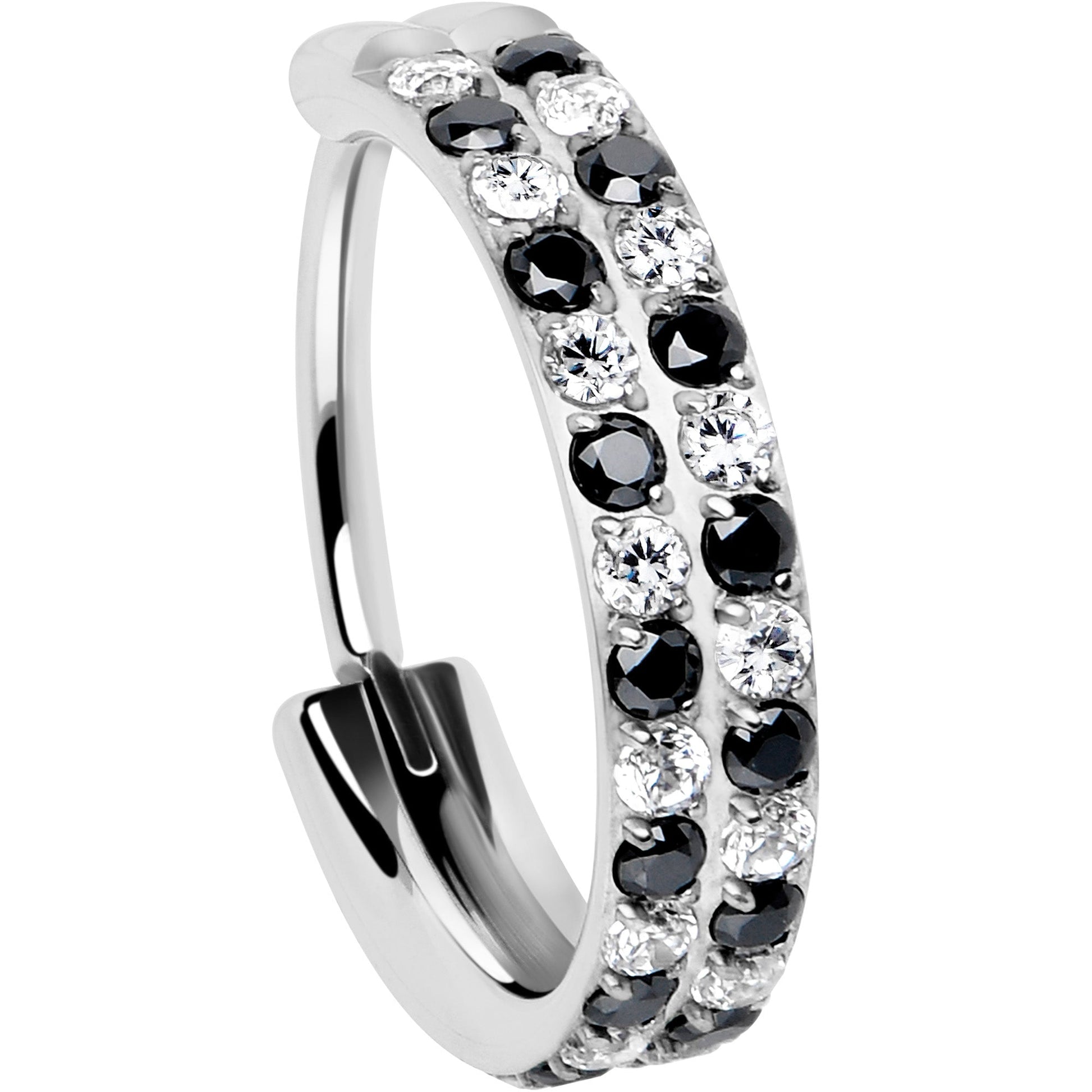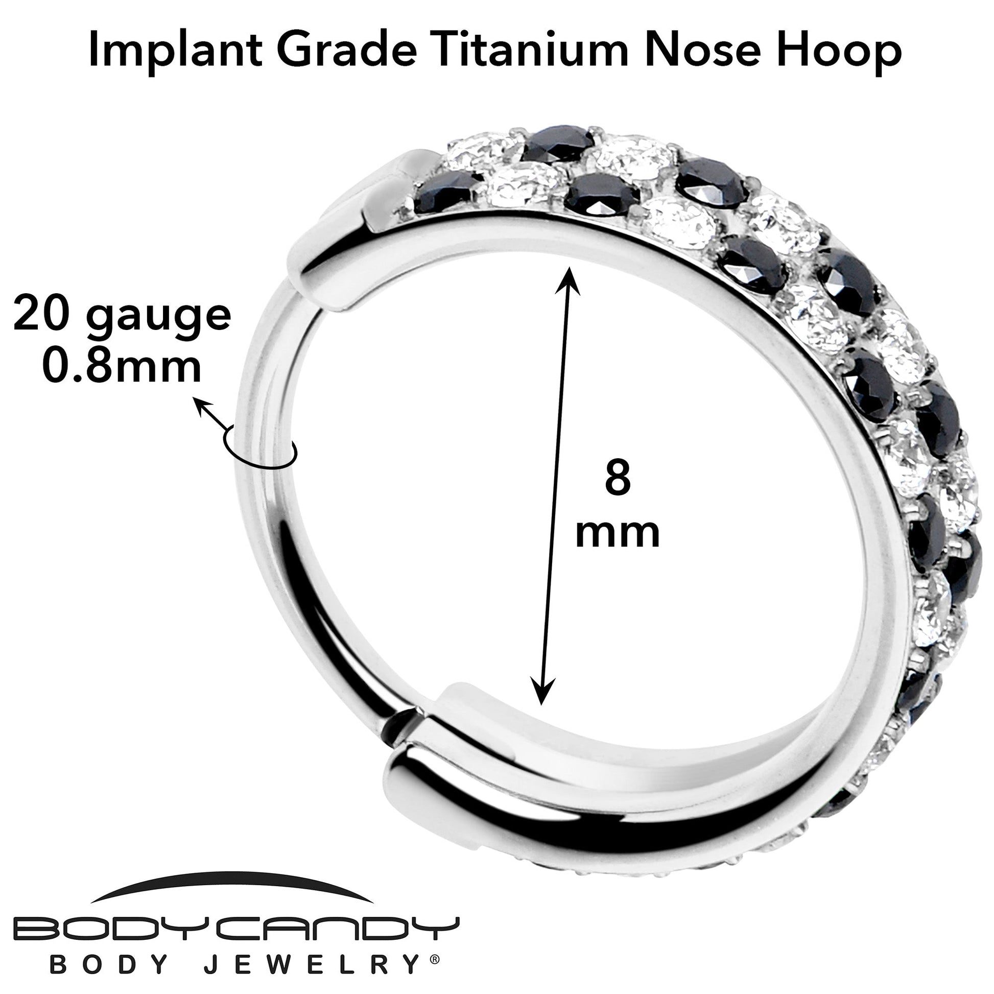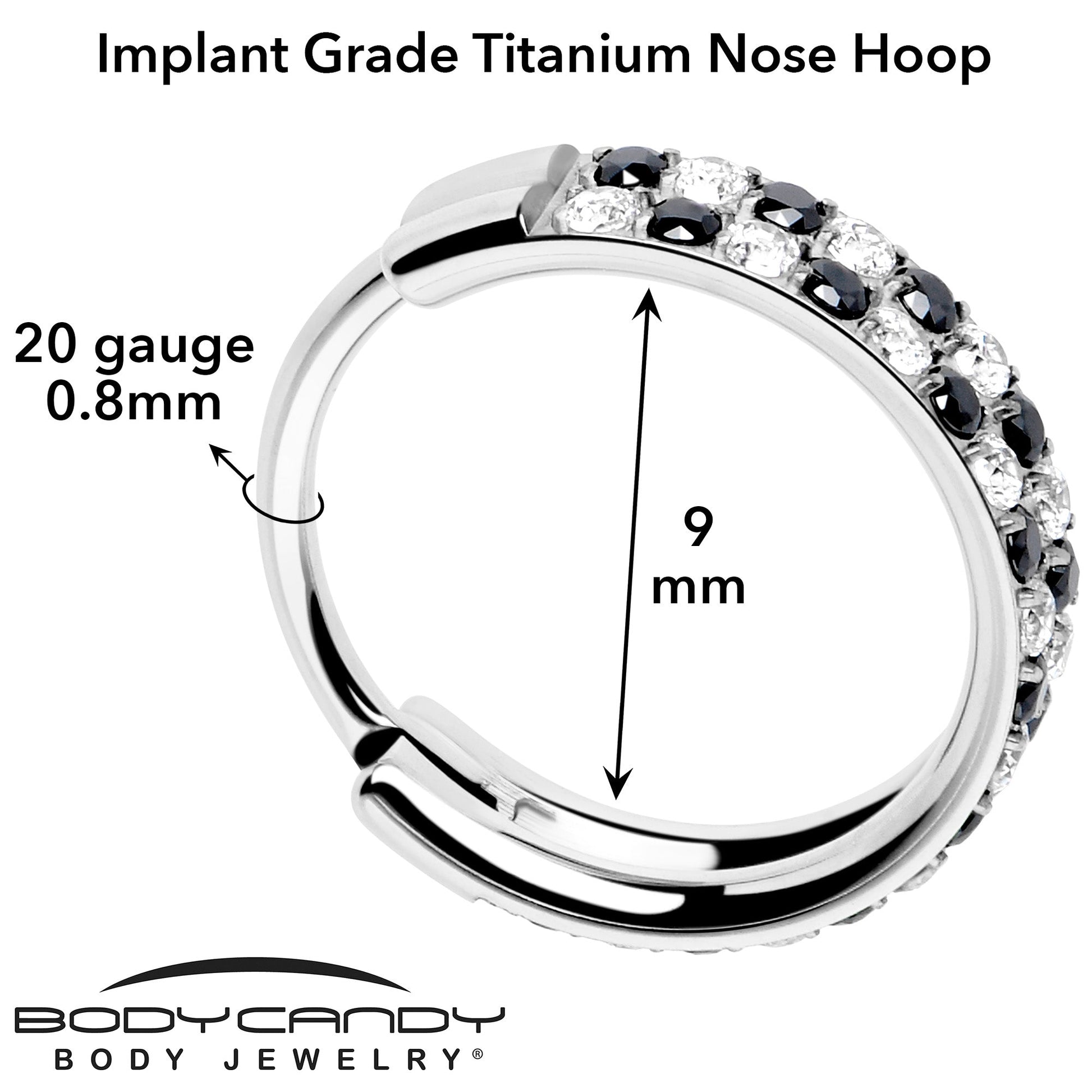 Why play games with your style when you can rock this 20 gauge hinged nose ring? It's made with Hypoallergenic ASTM F-136 Implant Grade Titanium; this hinged circular ring also has an 18k Gold over Titanium option available. The dazzling double row checkerboard pattern of black and clear cubic zirconia gems is guaranteed to set you apart from the pack.