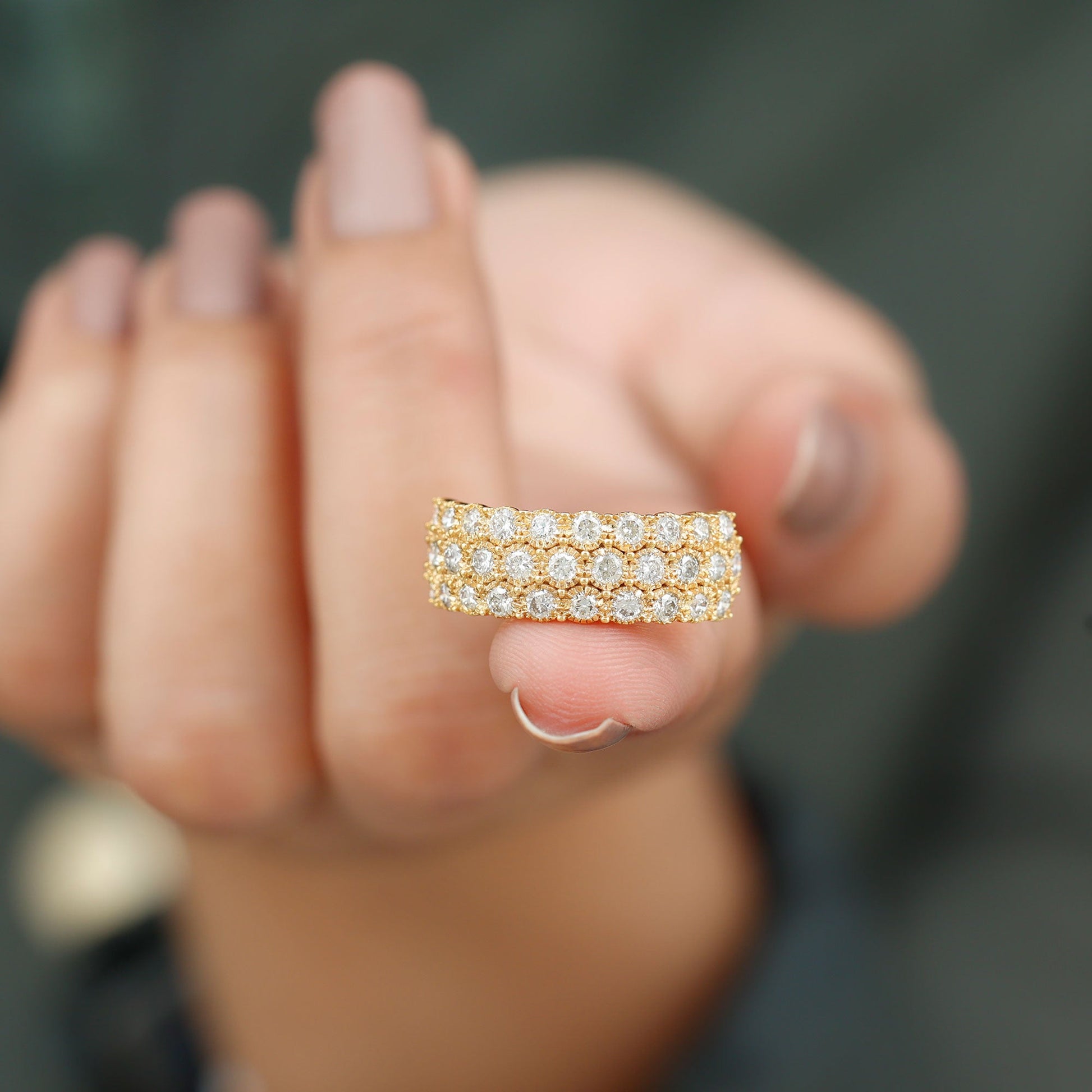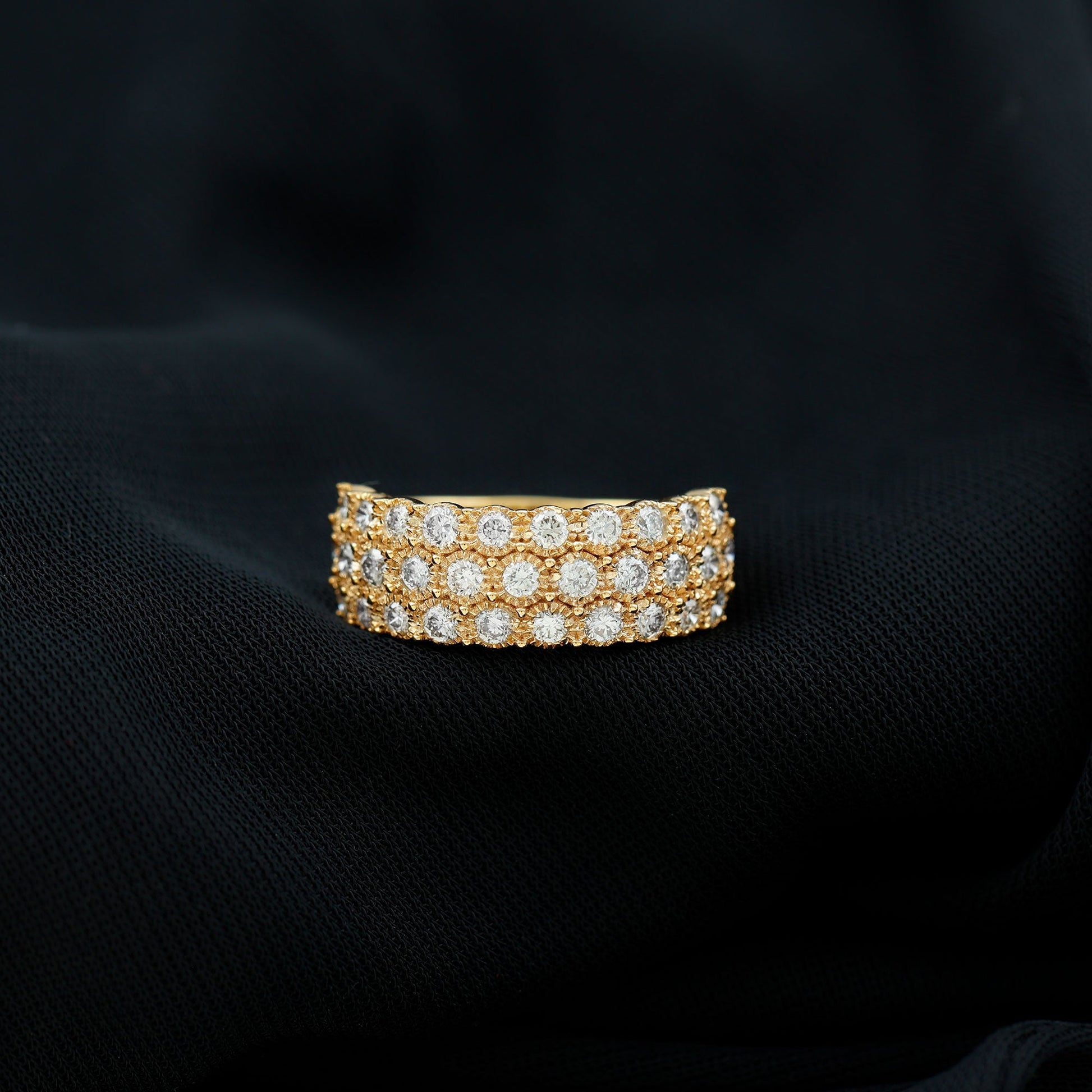 Mark special moments with a ring that shines with love and meaning. The 3 Row Diamond Wedding Band is designed to show the beauty of commitment and the joy of lasting memories. Three sparkling rows of round lab created diamonds sit gently on the top half of the band, held in detailed engraved bezel setting. Each stone catches the light with every move, adding a soft, glowing sparkle to your hand. The design forms a half eternity style, meaning the diamonds cover only the top part of the band. This gives the Thick Wedding Band a balance of beauty and comfort, perfect for wearing every day. Whether it is worn as a wedding band, an anniversary ring, or a gift to yourself, it brings a touch of elegance to any moment. This Wedding Anniversary Band features EF-VS quality lab grown diamonds, made in a way that is better for the planet and free from conflict. It is a lovely mix of bold and refined, simple and meaningful. Packed in a beautiful jewelry box, it is ready to bring a smile to someone's face. Perfect for marking love, growth, and everything in between, this Diamond Half Eternity Band is a reminder of every step you have taken together.