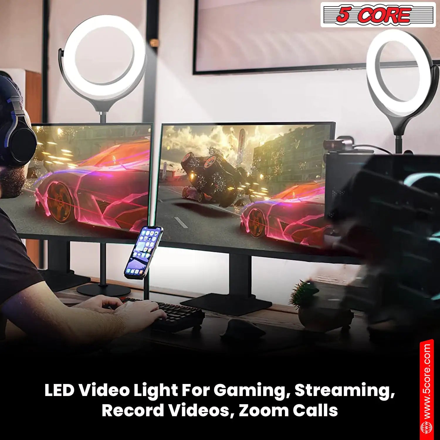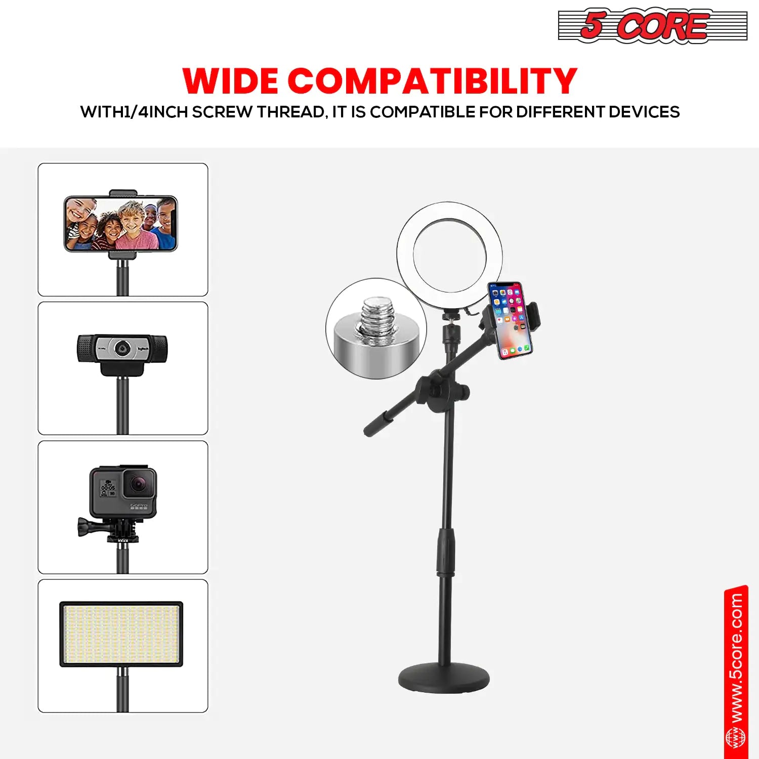 - Desktop Overhead Ring Light Kit: The 5 Core ring light with stand and phone holder is made of high-quality carbon steel and ABS materials and includes a 6-inch phone light ring and a 360-degree adjustable C-Clamp stand. The Android & iPhone ring light produces soft and uniform light and can be adjusted as needed. It is considered the best phone stand for video recording, live streaming, portrait photography, and makeup application, among other uses.