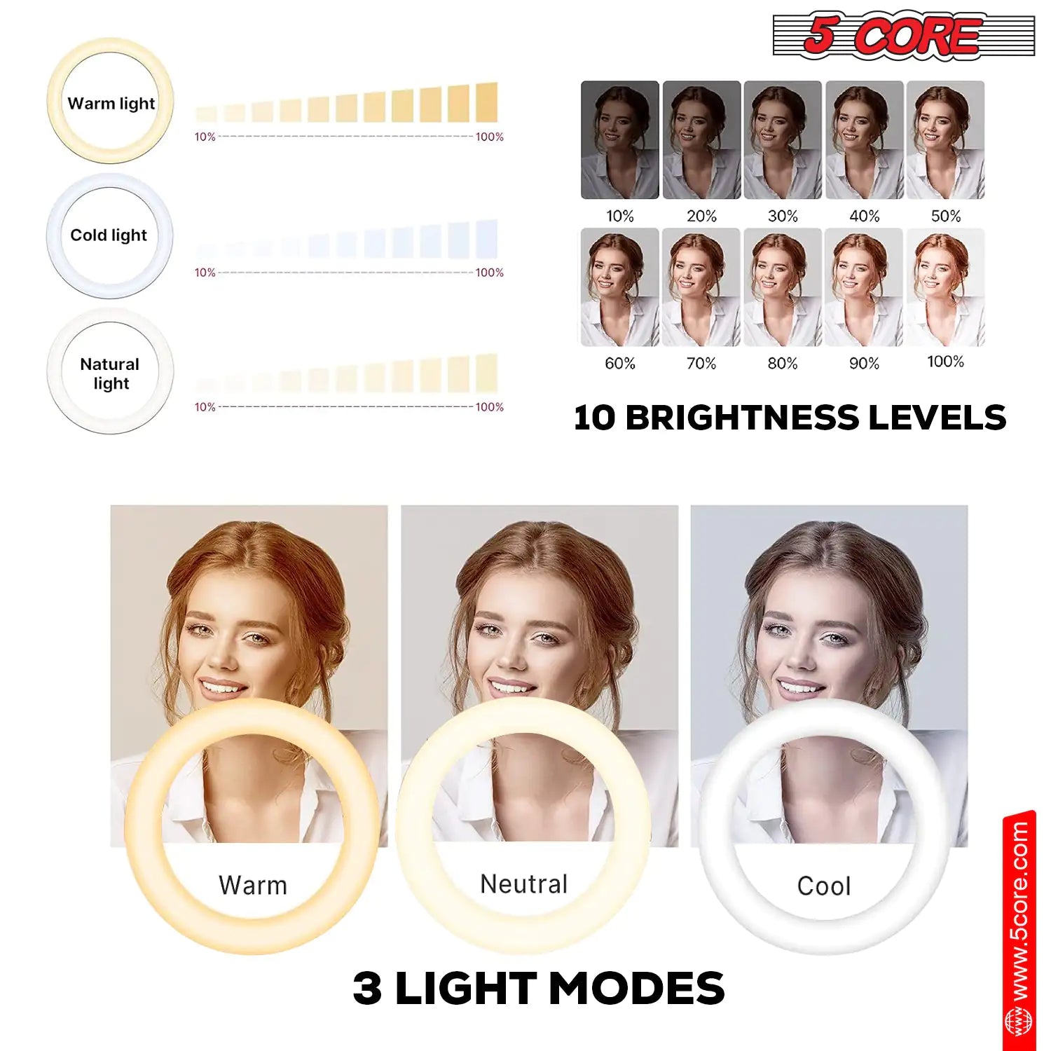 The 6-inch phone light ring stand offers 3 light modes and 10 adjustable brightness settings, giving you complete control over the lighting environment. |