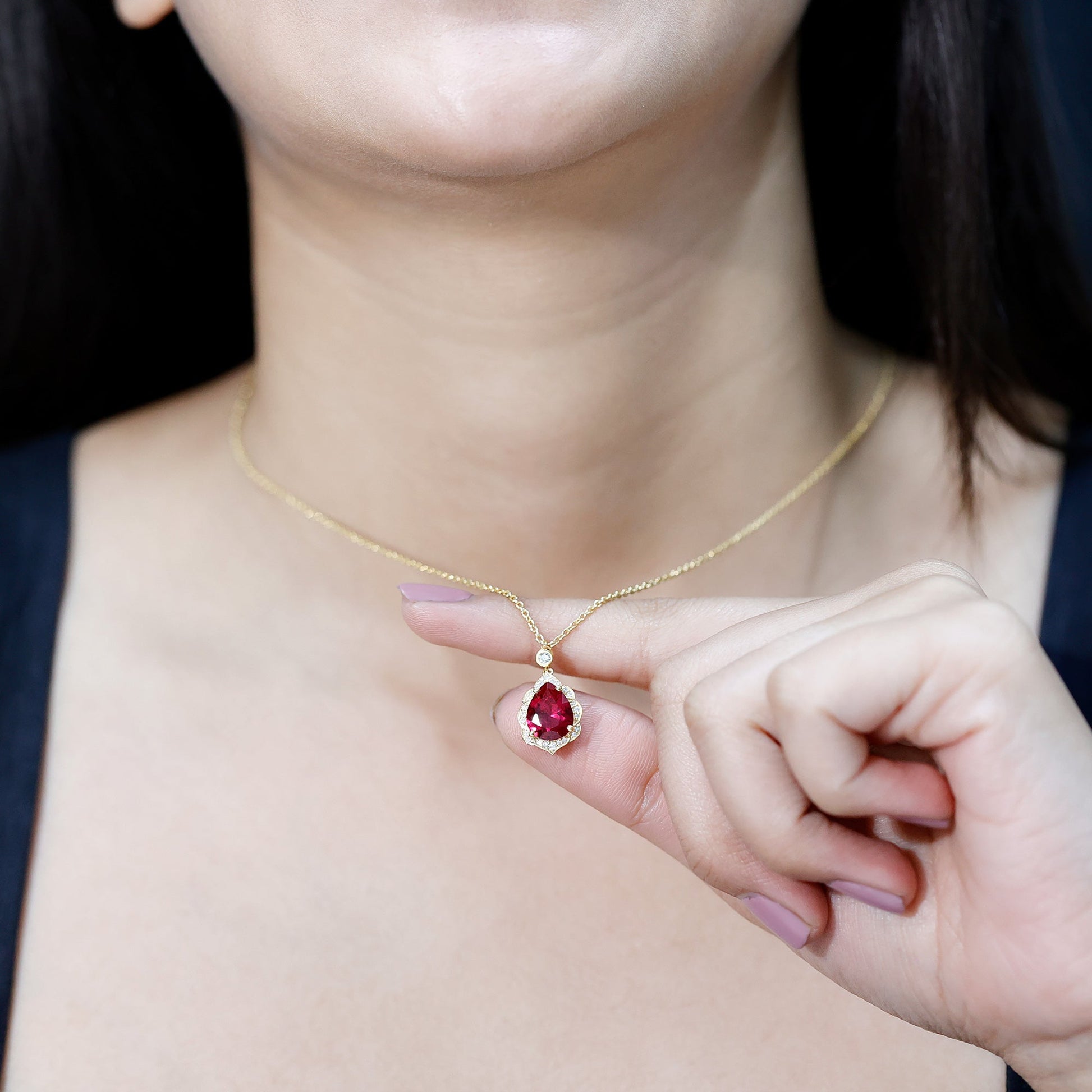 Add a touch of vintage charm to your look with this Statement Pendant Necklace featuring a beautiful 8X10 mm Pear Shape Lab Created Ruby of AAAA Quality in Prong Setting, as a center stone, shining in a deep red color that stands for love, passion, and strength. Surrounding the Lab Ruby is a leaf pattern adorned with sparkling, dainty Lab Grown Diamond stones, giving the pendant a natural and elegant feel. This Ruby Diamond Necklace is inspired by vintage styles, making it feel timeless and special. The leaf pattern adds a gentle touch, as if you are wearing a piece of nature close to your heart. The Lab Grown Ruby and Diamond offer the same brilliance and beauty as natural stones, but are made in an eco-friendly way. This Teardrop Pendant hangs from a fine chain, perfect to wear every day or for special occasions. Crafted in Yellow Gold Plated Silver, this Lab Grown Ruby Necklace makes a bold statement, drawing attention in a simple and graceful way. Whether you want to gift it to someone special or treat yourself, this Ruby Vintage Necklace brings together classic style, natural inspiration, and modern sustainability. It comes in a pretty box, ready to wear and admired.