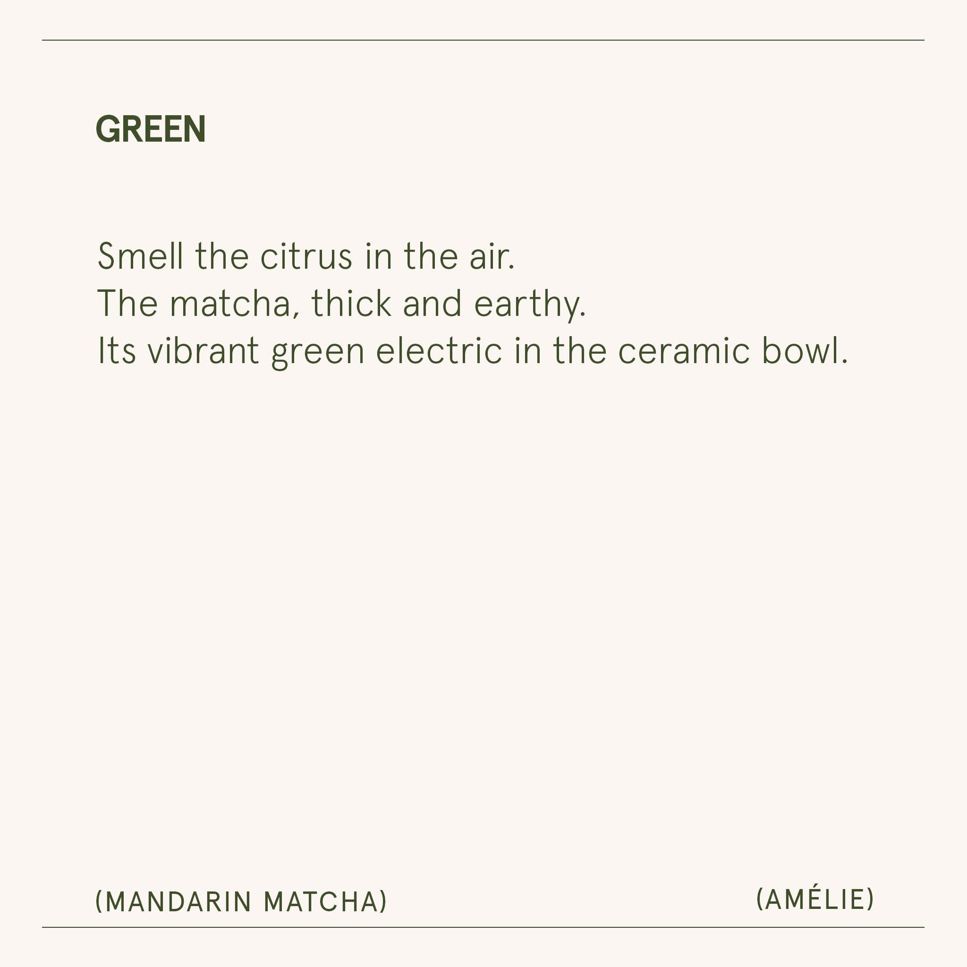 Rediscover balance with the Mandarin Matcha Candle, a radiant fusion of zesty mandarin and serene green tea, deepened by soft florals and cedarwood. Light it to elevate your mood and turn any space into an oasis of calm and inspiration.