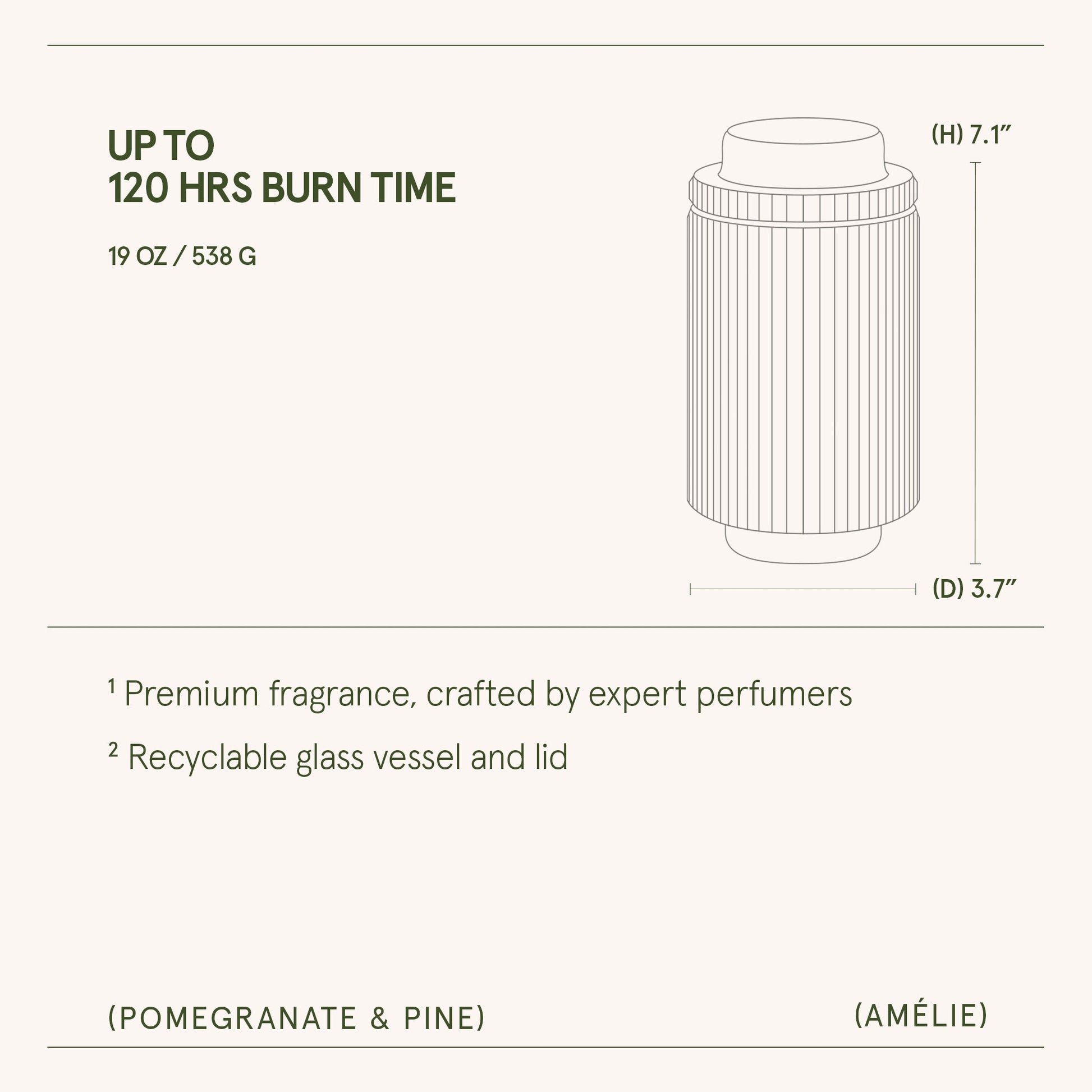 Bright and cozy, the Amélie Pomegranate & Pine Candle layers sweetness of ripe pomegranate with the invigorating crispness of pine, deepened by warm cedarwood and musk. Ideal for creating a lively and welcoming atmosphere.