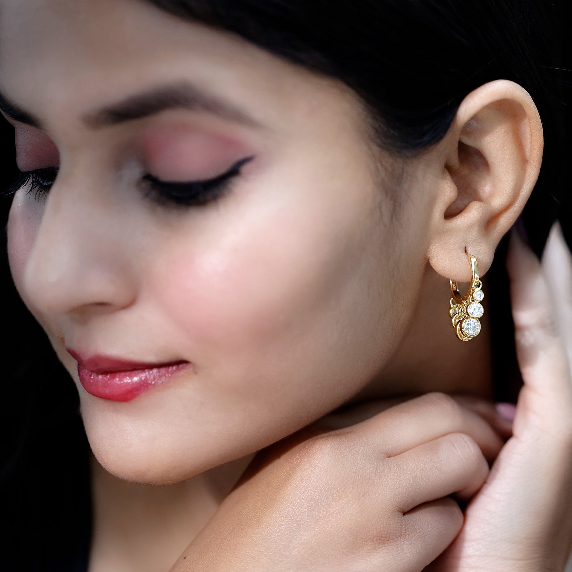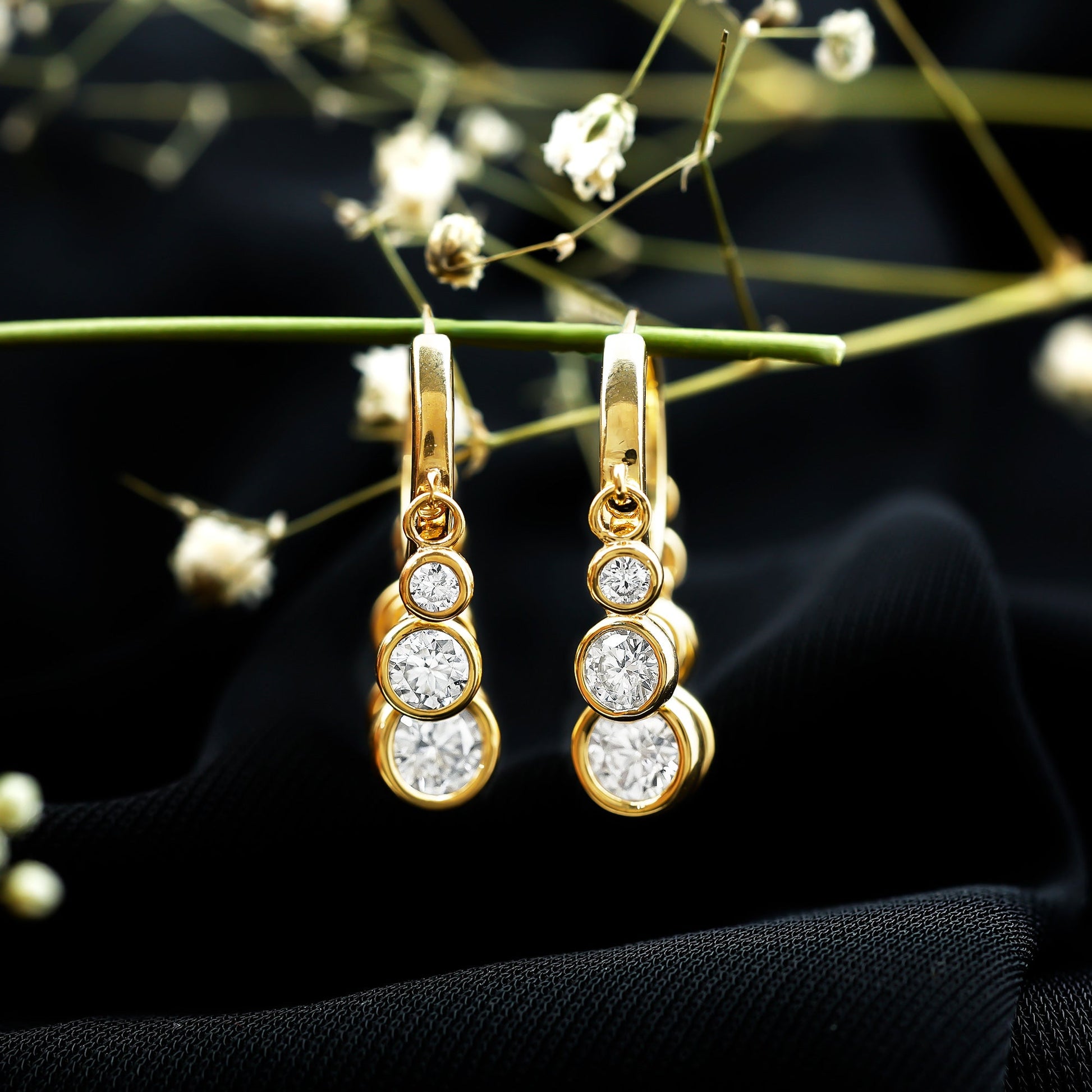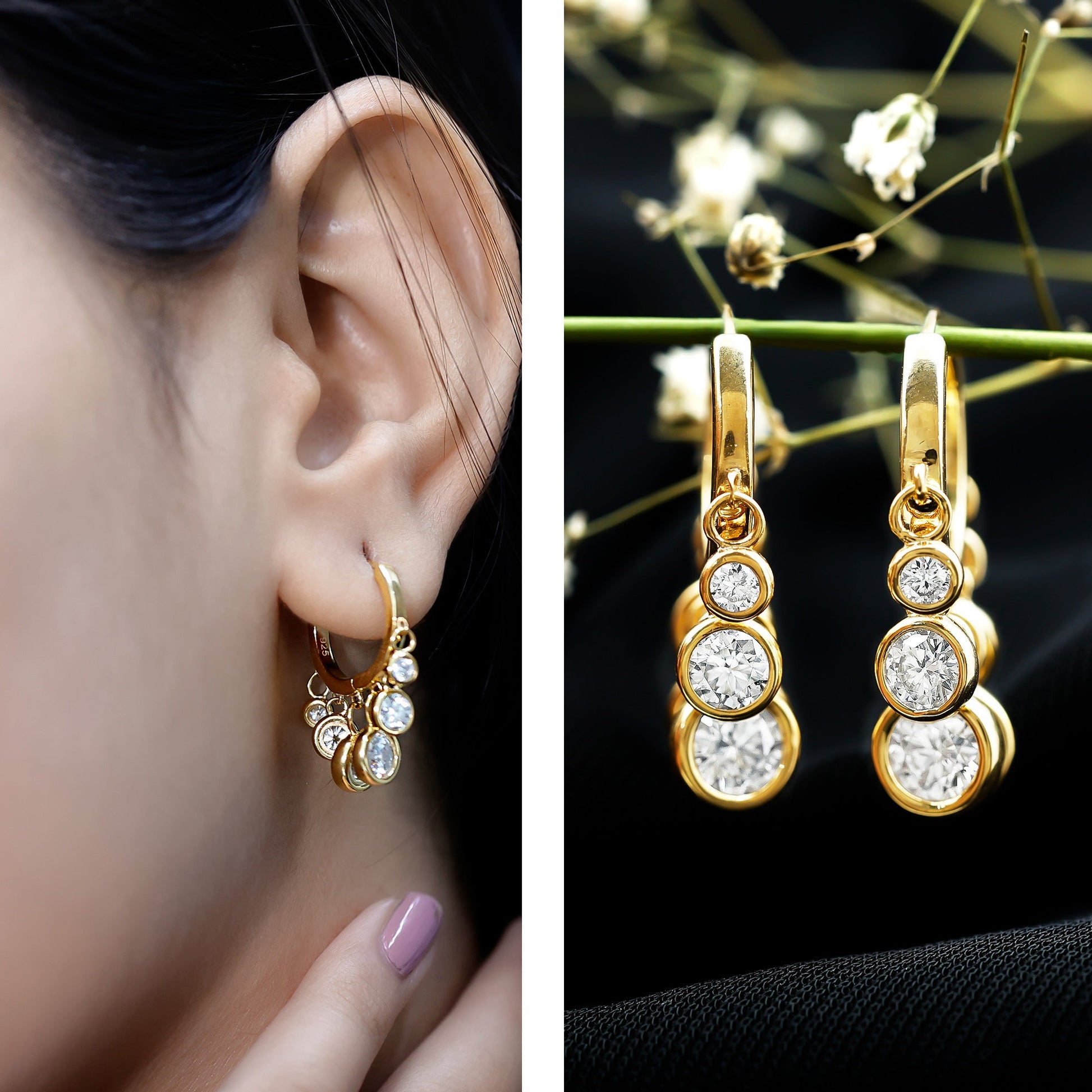 Let your love shine as bright as these Moissanite Hoop Earrings, a perfect gift for moments that matter. Whether you are celebrating Mother’s Day, Valentines Day, a birthday, an anniversary, or simply want to show appreciation, these Hoop Drop Earrings are a thoughtful and timeless choice. Crafted from yellow gold plated sterling silver, they offer a beautiful mix of modern charm and classic elegance. Each earring features a sleek hinged hoop for easy, secure wear. Dangling gracefully from the hoop are three round moissanite stones measuring 3 MM, 4 MM, and 5 MM, set in smooth bezel setting that highlight their brilliance. The stones are D-VS1 quality, known for their exceptional sparkle, fire, and clarity, making them a stunning alternative to diamonds. The graduated drop design adds soft movement and eye-catching shine, making these Hinged Hoop Earrings perfect for both everyday wear and special occasions. These Small Hoop Earrings are lightweight, comfortable, and easy to style, ideal for any woman. Packaged in a lovely jewelry box, these Moissanite Huggie Earrings are ready to gift. Their timeless style and lasting beauty make them a keepsake to be cherished for years to come.