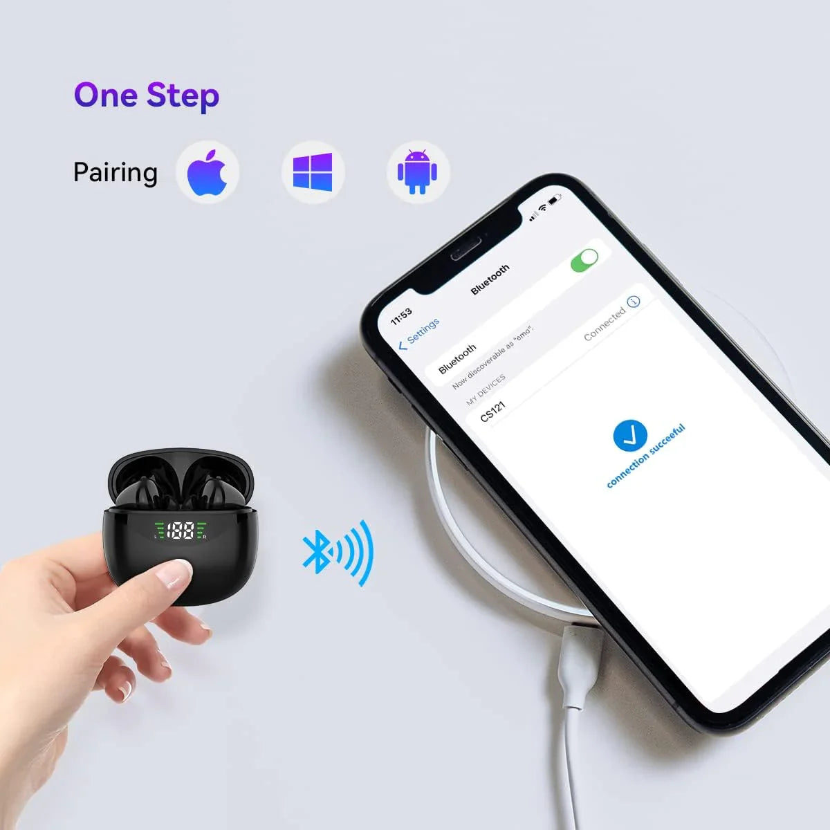 First pairing, just open the case, no need to take out earbuds, select "CS121" on your phone's Bluetooth menu, and both ear buds will connect with your phone immediately. Wireless earbuds can auto-connect with your last device next time. Bluetooth earphones with touch control, you can control music play/pause, previous/next track, volume+/-, answer/reject, end calls and enable voice assistance by tapping on earbuds. No need to adjust these on your phone.