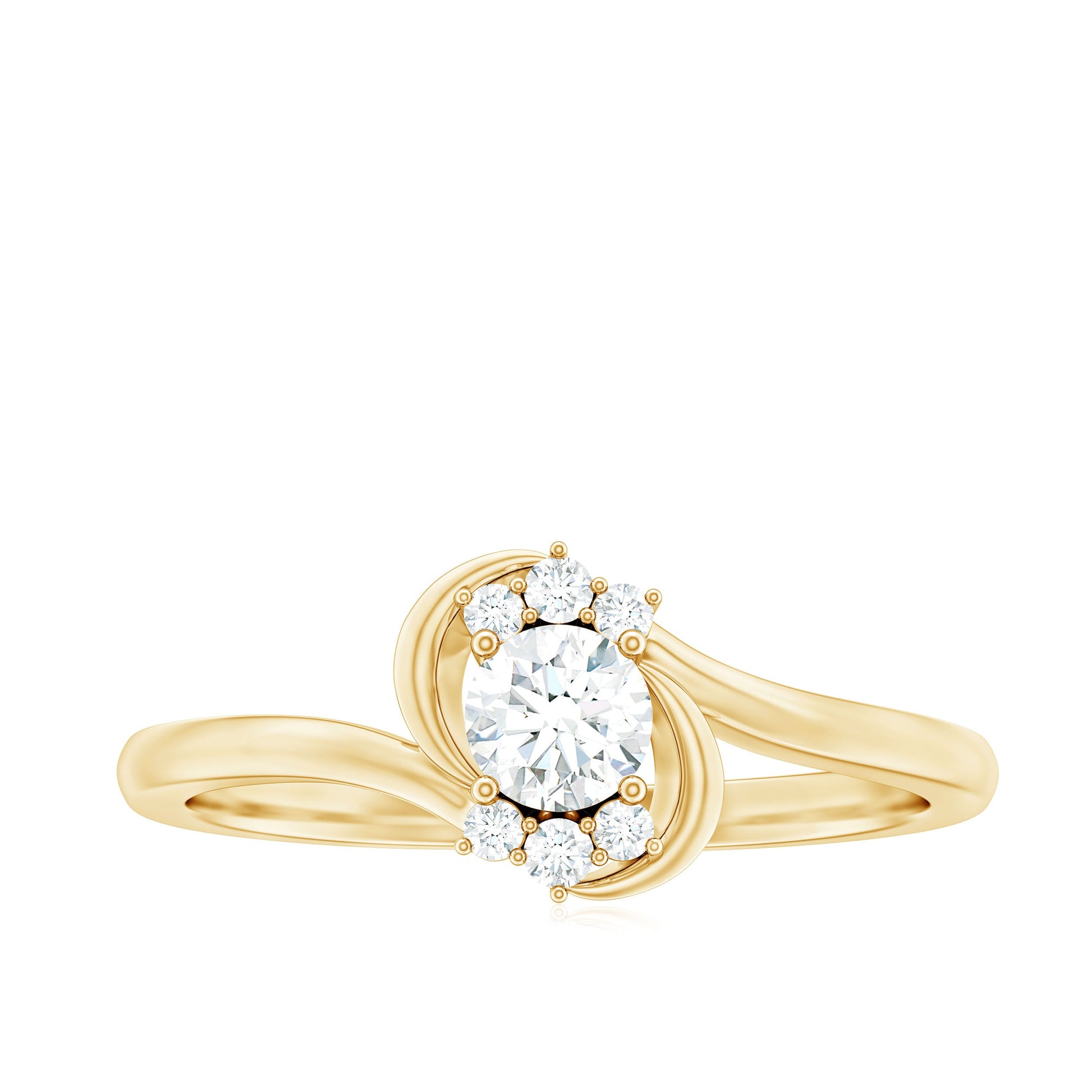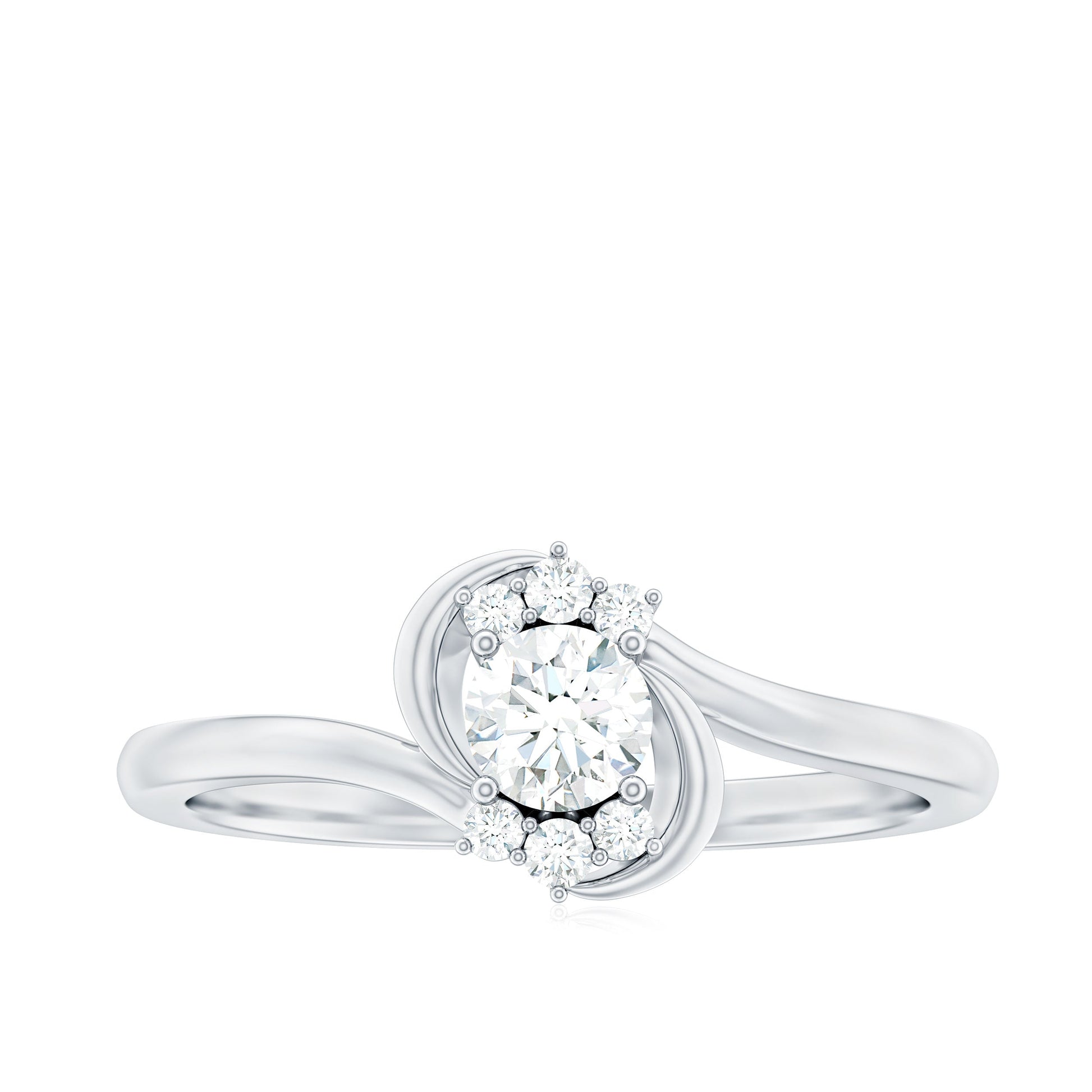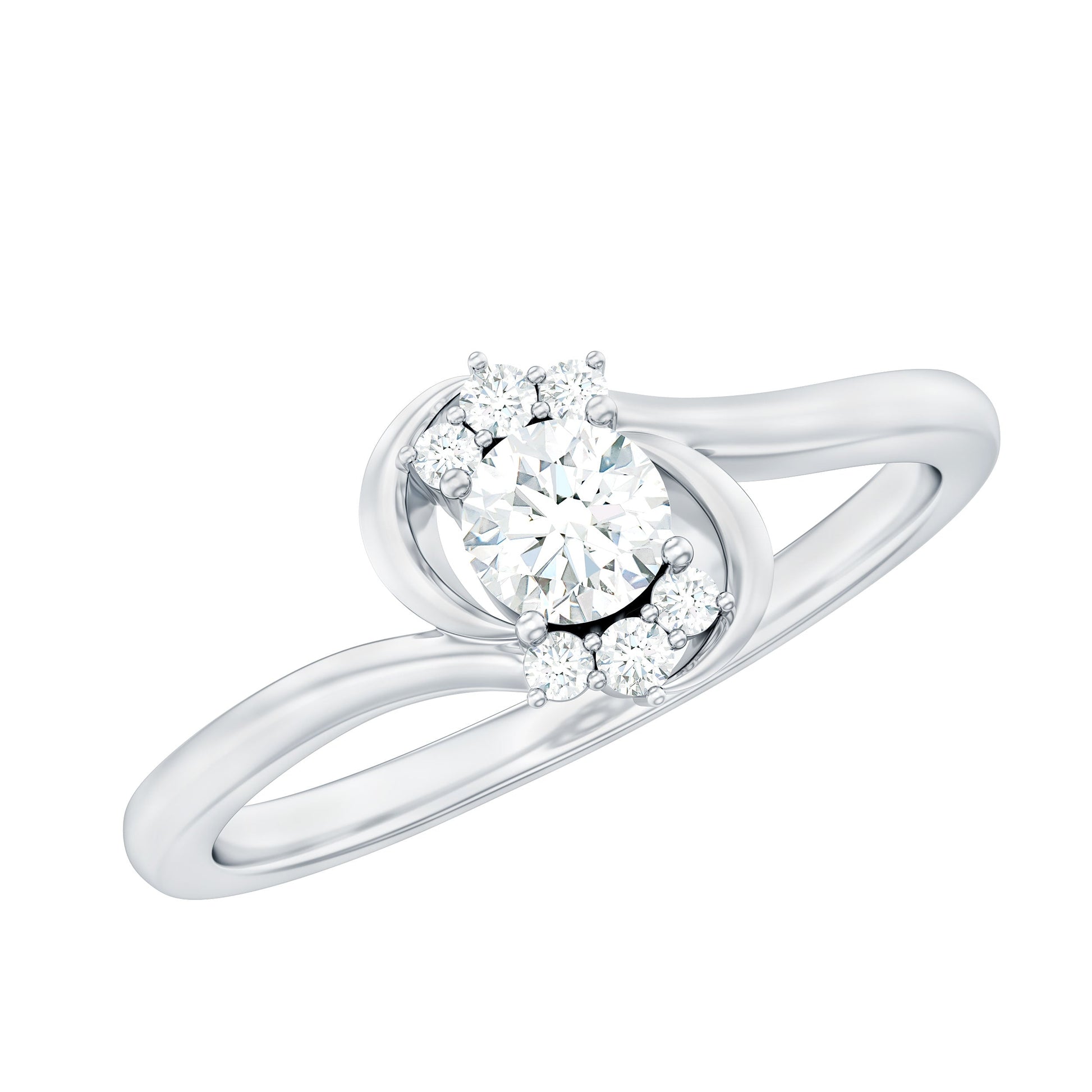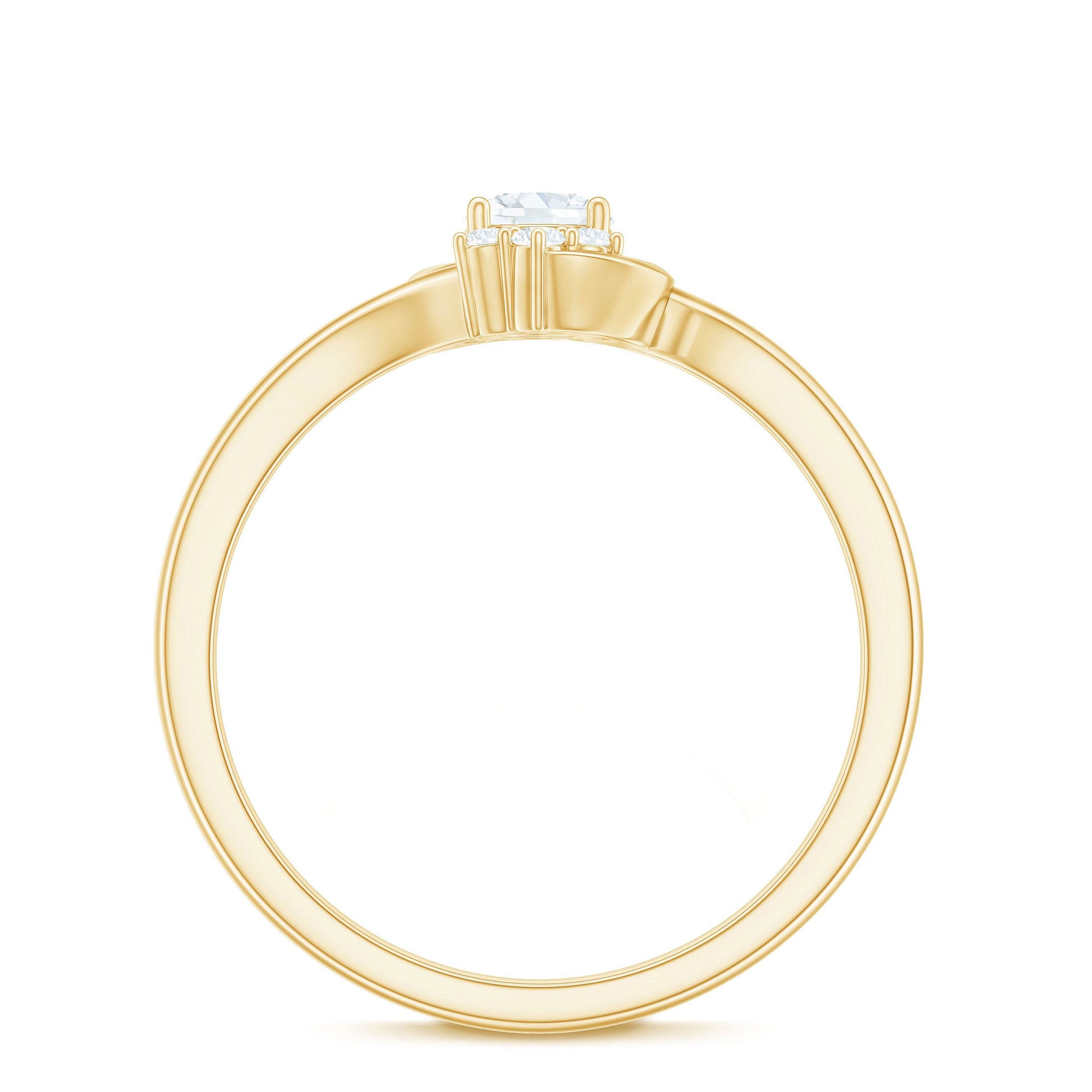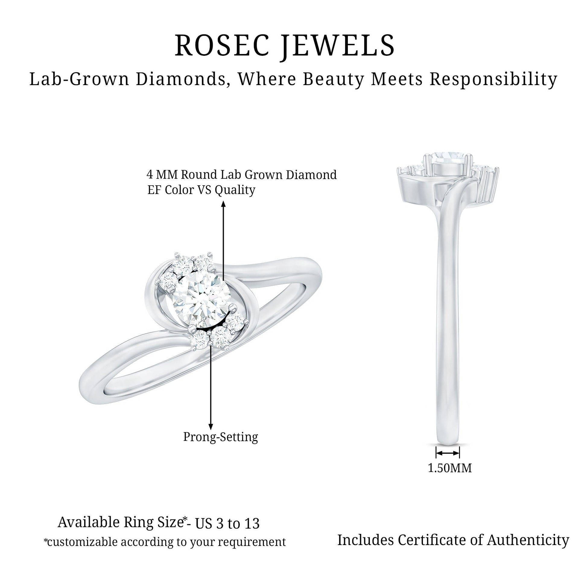 A meaningful way to express love and commitment, the Lab Grown Diamond Promise Ring blends timeless beauty with a touch of modern design. At the center of the ring sits a 4 MM round cut lab grown diamond, held securely in prong setting. The Minimalist Ring features a graceful bypass shank, a unique design where the band gently curves around the center stone, symbolizing two paths coming together as one. Flanked by small round cut stones, the center diamond is highlighted with extra brilliance and charm, adding depth and meaning to the piece. Known for its dazzling sparkle and durability, the EF color VS clarity lab made diamonds shine brightly. Perfect for couples who prefer a simple yet special way to mark their bond, this Diamond Bypass Ring is ideal for promise rings, pre engagement, or even as a thoughtful gift to mark an important moment. It is elegant enough to stand out, yet subtle enough for everyday wear. Available in a range of metal colors and purity options, the Lab Created Diamond Ring can be customized to suit different styles and preferences.