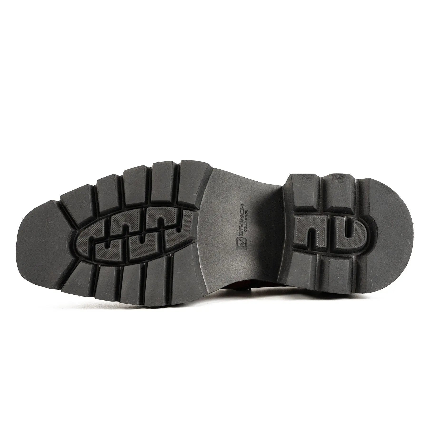 Built for both style and comfort, these derby shoes feature a chunky black rubber sole with distinctive red piping along the edges, creating a striking contrast. The zigzag tread pattern ensures reliable traction, making them as practical as they are fashionable.