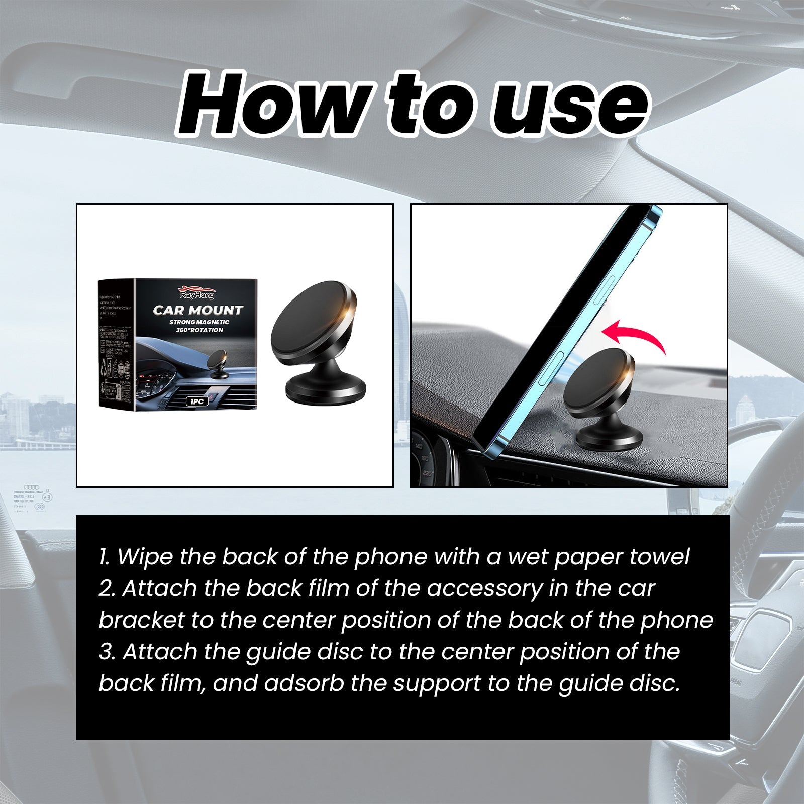 Our car mounts contain ABS, magnets. It's small and compact, comfortable and space-saving, and can be installed and installed in seconds. Its use method is very simple: 1. Wipe the back of the phone with a wet paper towel 2. Attach the back film of the accessories in the car bracket to the center of the back of the phone 3. Attach the guide disc to the center of the back film and attach the support to the guide disc. And it can automatically release heat to prevent the phone from overheating due to long-term use on the rack.