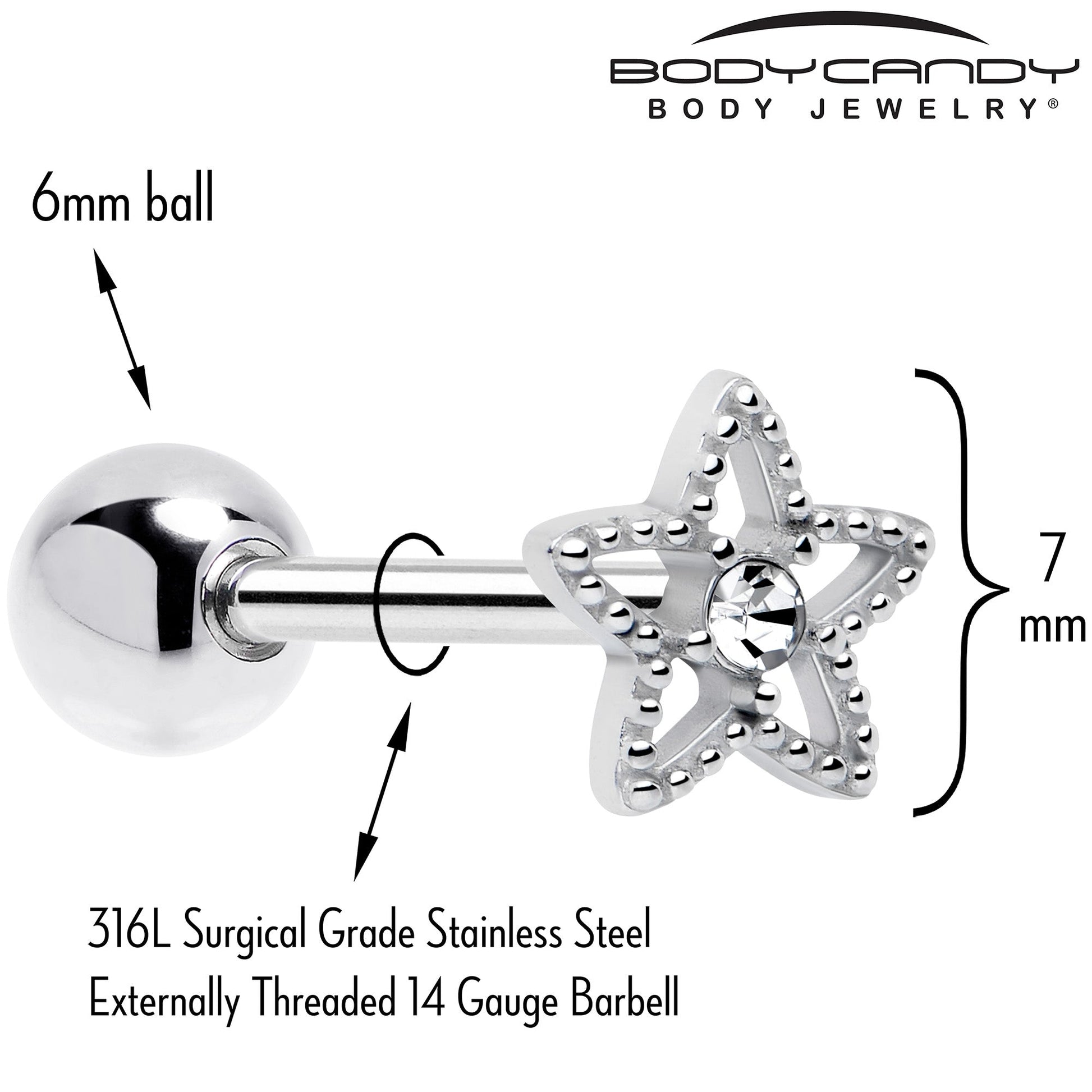 You do not need to be on the silver screen look like a star when you're rocking this 14 gauge tongue jewelry. It is made with a 5/8 inch 316L surgical grade stainless steel straight barbell with a 6mm bottom ball end. The top end features a star charm with textured detailing and set with clear gem in the open center for a thoroughly glam look. Whether you are a celebrity or just have a taste for the good life, this heavenly tongue piercing ring will make you feel like a star.Specifications