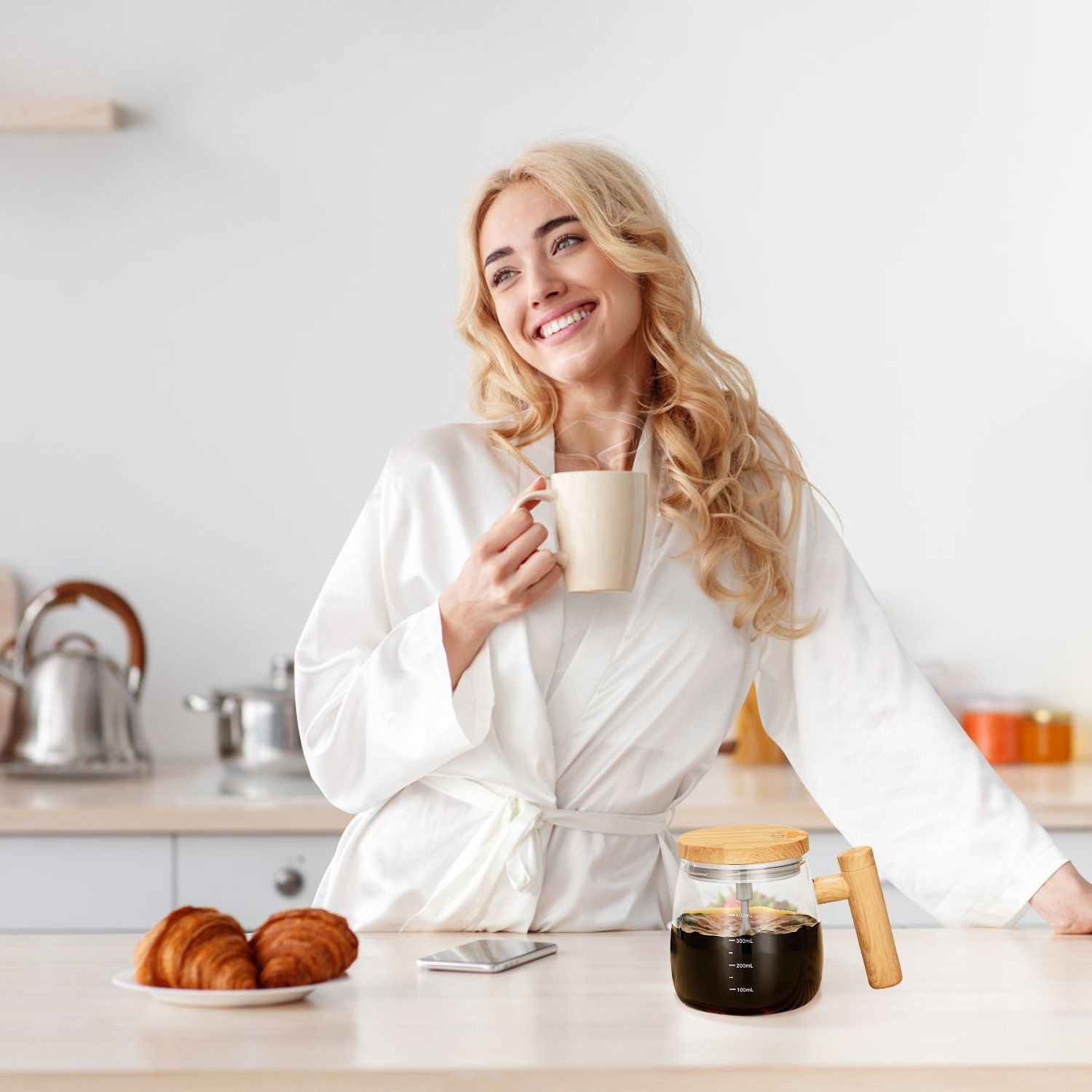 *Premium Glass Construction*:Made of high borosilicate glass,our self string mug is heat-resistant up to 302℉. The glass is dishwasher safe and healthy to use. The wood grain lid adds style and the stirring rod can be removed and stored in the handle.