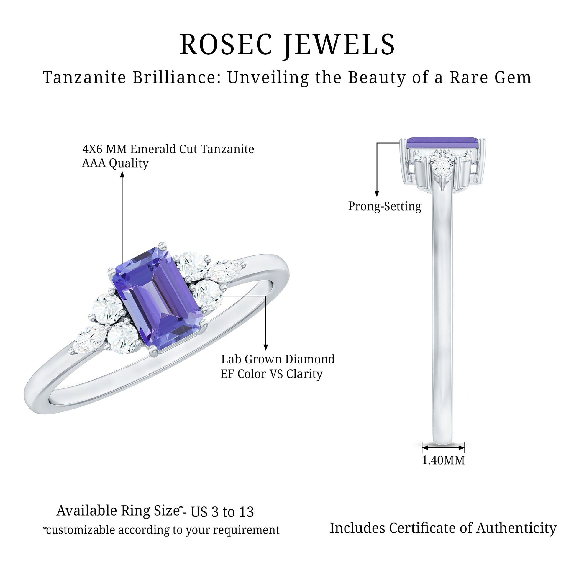 Start your journey together with this Tanzanite and Diamond Ring that captures the essence of love and thoughtful design. This Tanzanite Promise Ring, crafted in 14K white gold plated silver, is a beautiful reflection of connection and timeless commitment. Whether it is a promise, a meaningful milestone, or a symbol of what lies ahead, this piece is designed to hold significance. At the heart of the ring is a 4X6 MM emerald cut tanzanite, securely nestled in prong setting that gives it a clean and elegant look. Both sides of the center stone are decorated with a trio of round and marquise cut lab grown diamonds, adding sparkle and grace, catching the light with every move. This delicate arrangement creates a soft yet striking symmetry, adding charm without overwhelming the design. The band is sleek and polished, made for comfortable daily wear while still holding that little something extra that makes it perfect for special occasions. This Pre Engagement Ring is a gentle reminder of the love you share, the promises you make, and the journey you are on. Its style is classic with a modern heart, making it the kind of ring that will be cherished today and for many years to come.