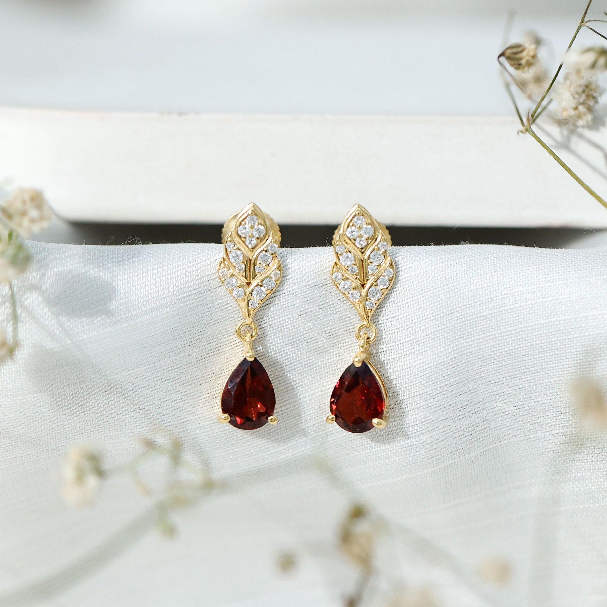 Genuine Garnet Teardrop Earrings with Diamond Leaf Design