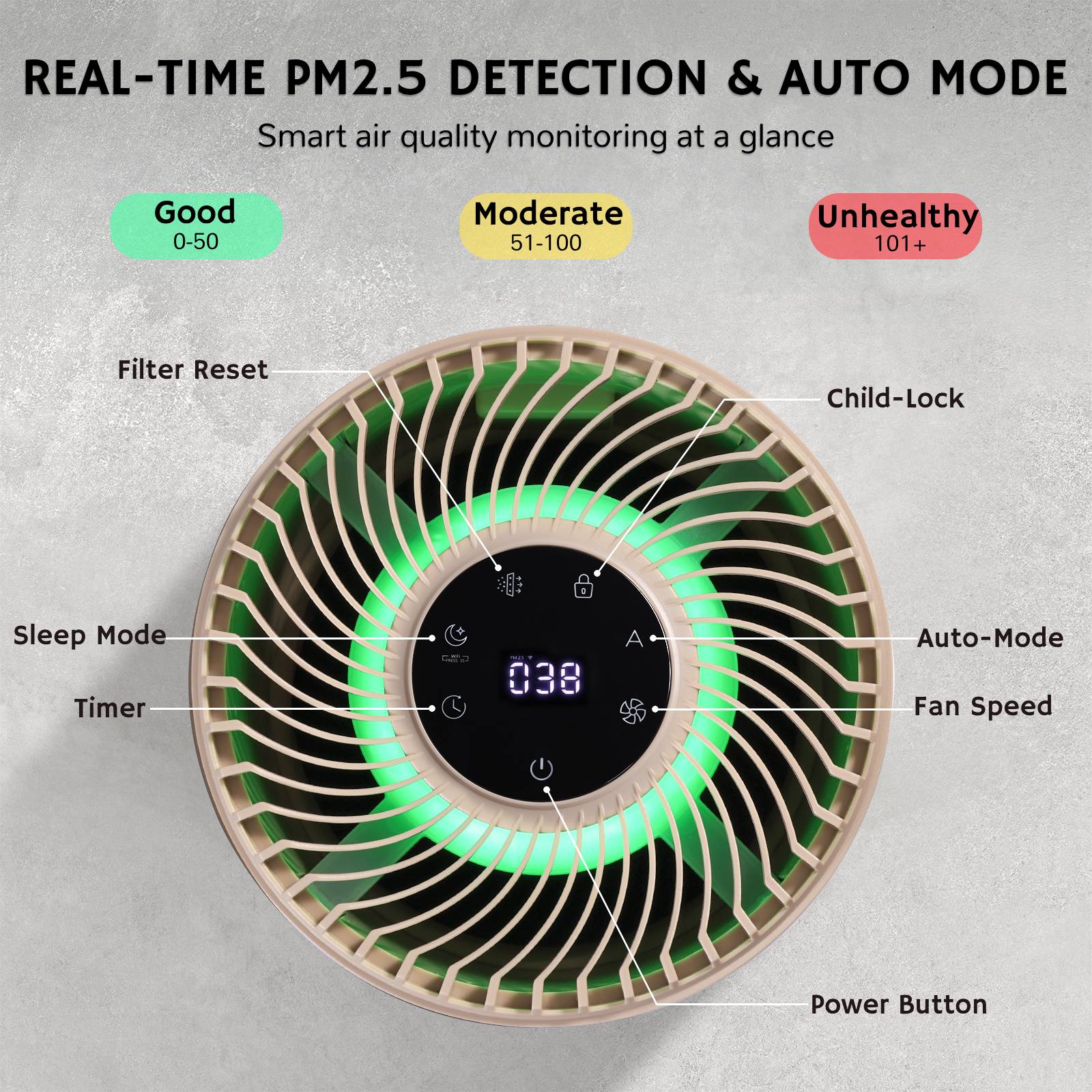 - Smart PM2.5 Detection & Auto Mode: Monitors air quality in real-time and adjusts fan speed automatically for optimal purification.