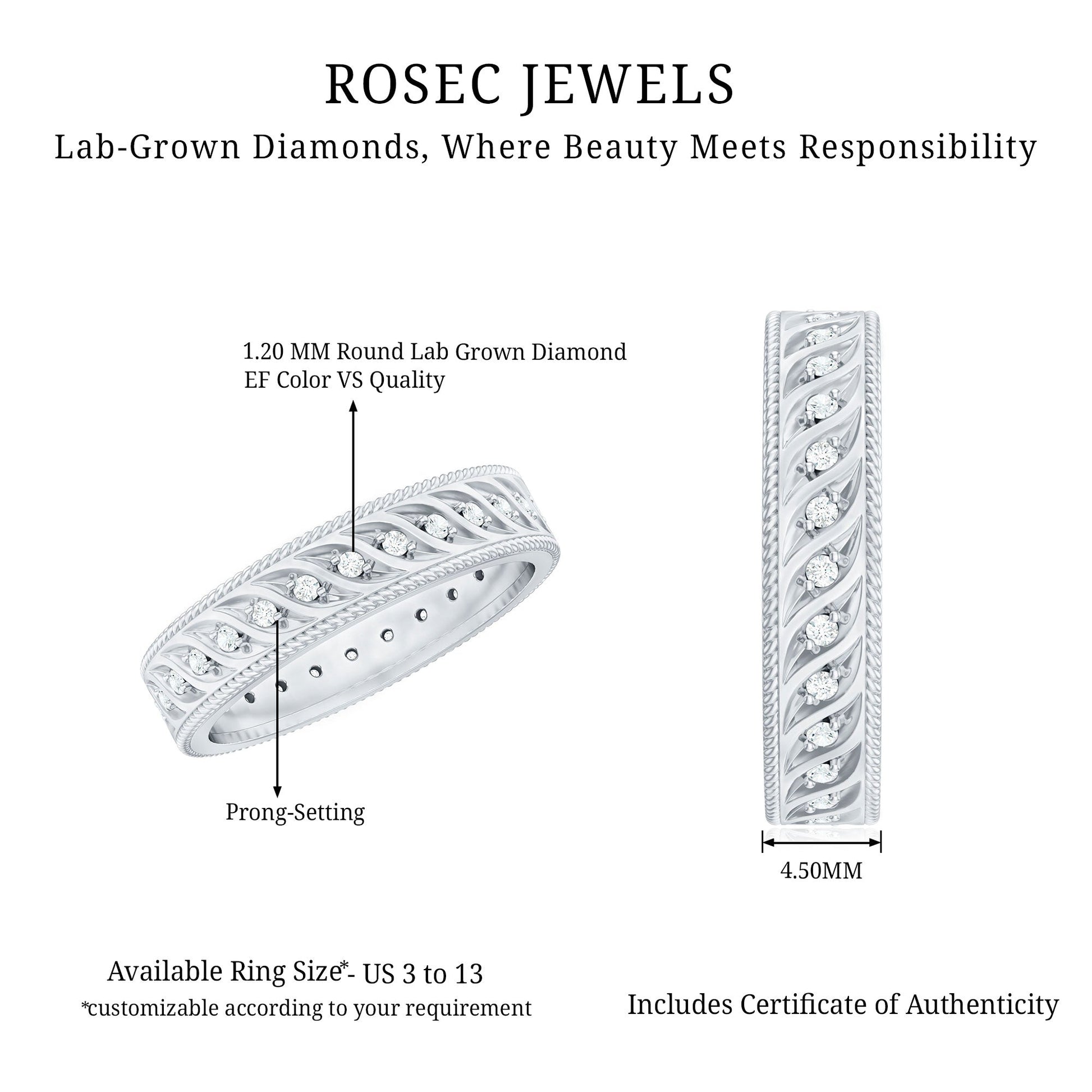 Love that grows stronger over time deserves this Lab Grown Diamond Band that shows it. The Twisted Rope Wedding Band is designed to reflect a bond that may bend but never breaks. With soft curves and delicate details, the Full Eternity Band gently wraps around the finger, symbolizing unity, strength, and forever. At the center of each engraved leaf-like pattern sits a round lab grown diamond, carefully set in prongs to catch the light with every movement. These lab created diamonds shine just like mined diamonds, but are made in a way that is more ethical and better for the environment. A twisted rope design frames the edges of the ring, giving it a vintage feel with timeless charm. The mix of texture and shine brings a unique style to the Vintage Eternity Band while still keeping it soft and romantic. It is a perfect piece for someone who enjoys meaningful jewelry with classic beauty. The band is available in US sizes 3 to 13 and can be worn on its own or stacked with other rings. Whether it marks an anniversary, a promise, or just a personal moment of love, this Wedding Anniversary Band makes everyday feel special.