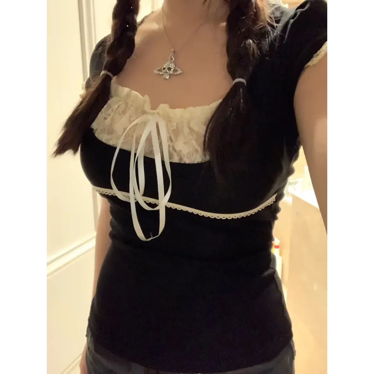 🌸 Introducing: Lace Trim Crop Top - Sweet Square Neck Harajuku Tee