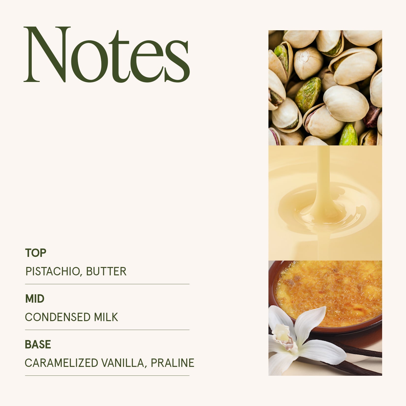 A delectable symphony of pistachio, orange blossom, and butter on top, melding into a heart of condensed milk, muguet, and violet, all enveloped by a luscious base of caramelized vanilla, tonka, and praline.