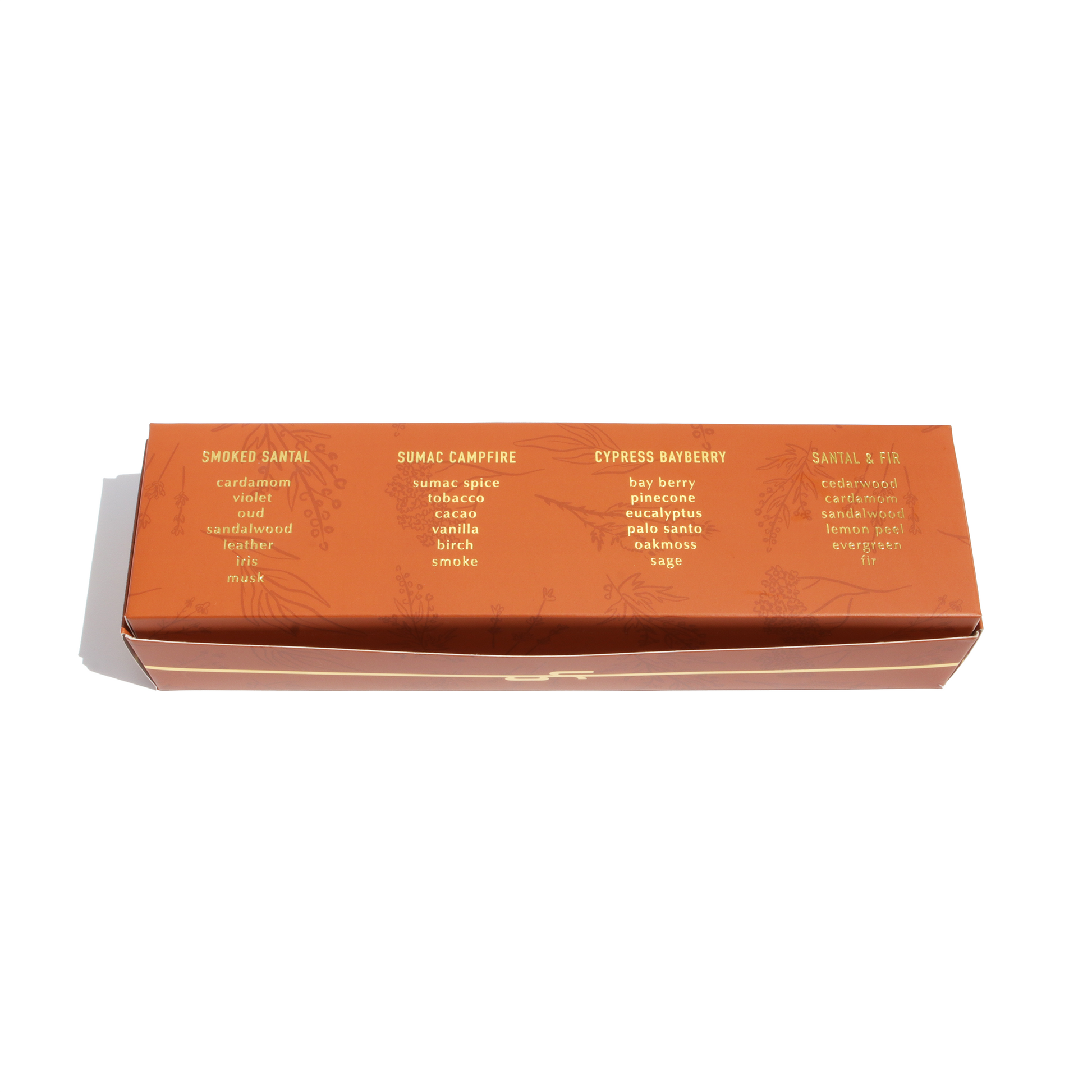 Our Mini Candle Collection comes beautifully packaged in a gift-ready box, featuring four 2 oz candles in our most beloved earthy, woodsy scents: Smoked Santal, Sumac Campfire, Cypress Bayberry, and Santal Fir. Perfect for cozy rituals, thoughtful gifting, or discovering your favorite fragrance for every season.