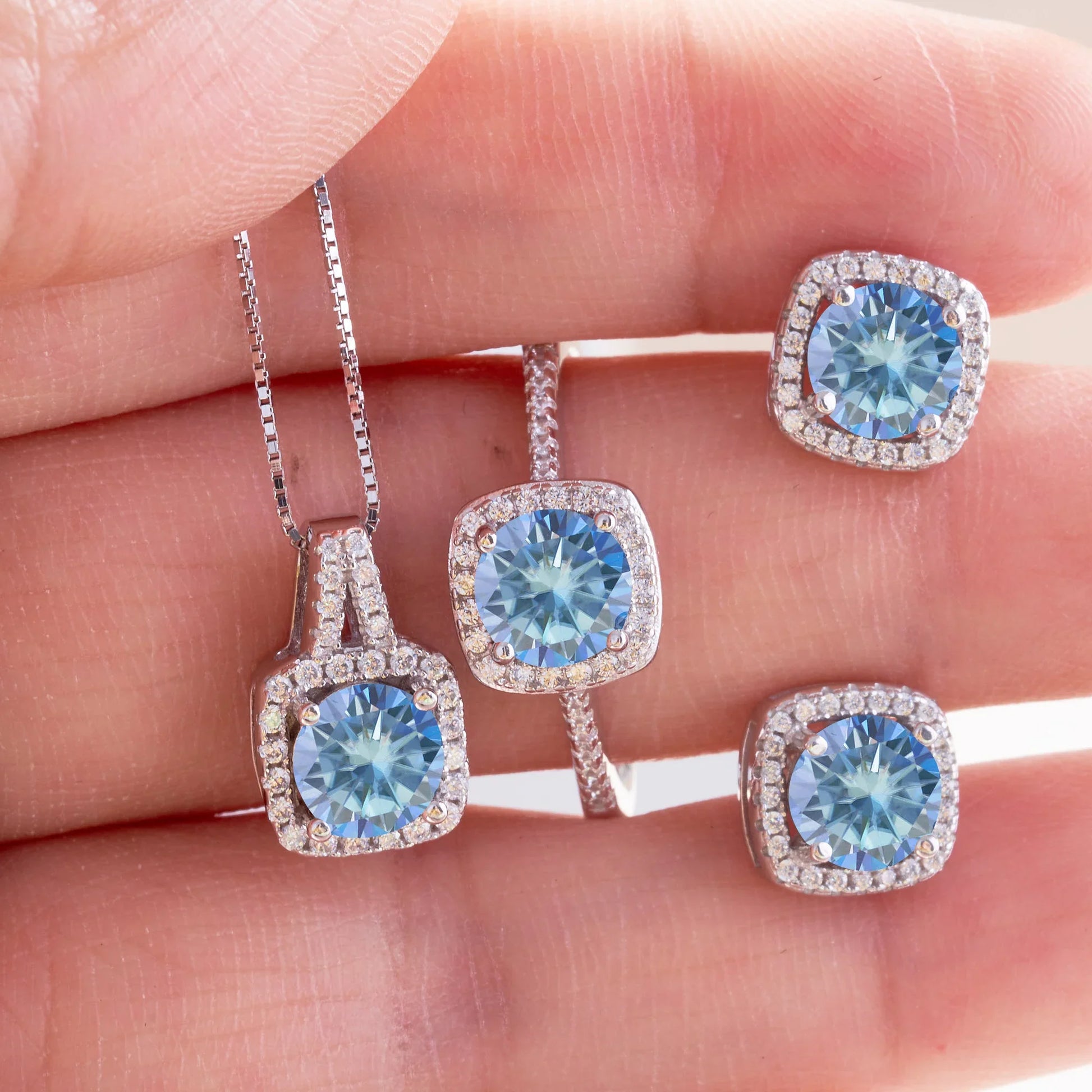 Moissanite D Color Round Cut 925 Sterling Silver Pendant Necklace and Studs Set