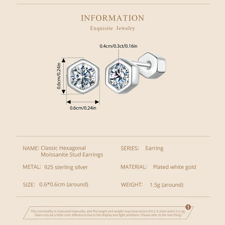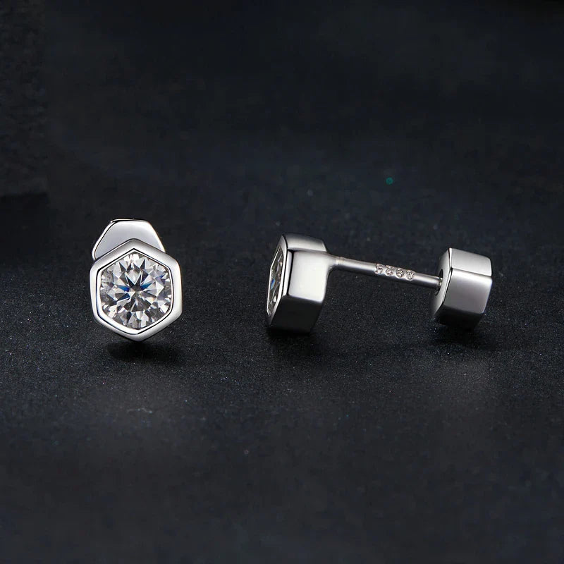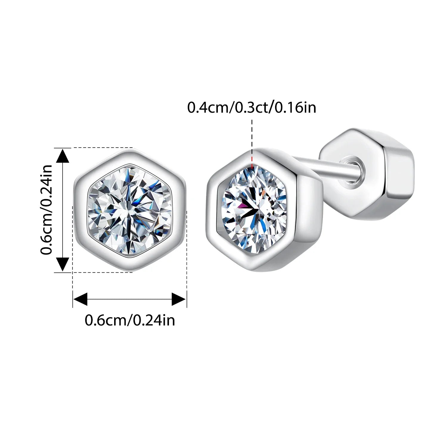 Moissanite Hexagonal Stud Earrings 925 Silver Screw-Back Bezel Gift