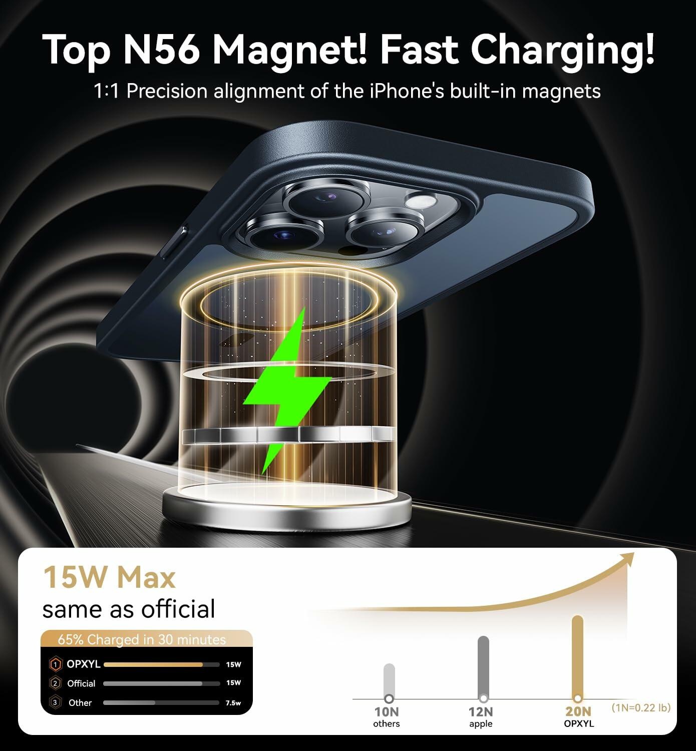 Features: 1.The TOP magnetic case is designed specially for the iPhone 13 Pro Max. Compatible with all official MagSafe accessories and third-party magnetic accessories such as magnetic charger, magnetic battery pack, magnetic power bank, magnetic car mount, magnetic phone stand, magnetic phone grip, magnetic wallet sleeve, magnetic cell phone card holder pocket and more. 2.20N Strong Magnetic Force, Beyond Industry Standards. Superior N56 magnets adhere seamlessly to the magnetic accessory with a magnetic strength that far outperforms its market counterparts, easily attaching any magnetic accessory up to 4.4lbs or less. 3.15W Fast Charging, Same Speed as Official. The core technology is magnets that are aligned 1:1 with iPhone's internal charging coils, reducing heat loss during the charging process for maximum charging efficiency(65% Charged in 30min). Note: The charger type is different, the charging speed is different. 4.Industry NO.1 Military-Grade Drop Protection. The OPXYL for iPhone 13 Pro Max shockproof case is equipped with 3-Gen airbags at the corners to absorb 99.99% of impacts. Up to 16FT drop protection far exceeds industry standards. Note: Data from lab tests (Test environment includes indoor and outdoor.) 5.Enhanced Screen & Camera Protection. The camera bezel has been raised by 2.5mm and the screen edges by 1.5mm, mainly to prevent scratches on the two most expensive parts of the phone. Note: Keep the screen and camera away from sharp objects. 6.Slim Ergonomic Design, Skin-Friendly & Smooth. Ergonomically designed, the OPXYL for iPhone 13 Pro Max case strikes the perfect balance between slimness and maximum protection. Innovative translucent matte design for a silky-smooth, non-sticky feel. The frosted texture of the soft frame provides excellent non-slip performance and a comfortable grip. Included: 1x Strong Magnetic for iPhone 13 Pro Max Case