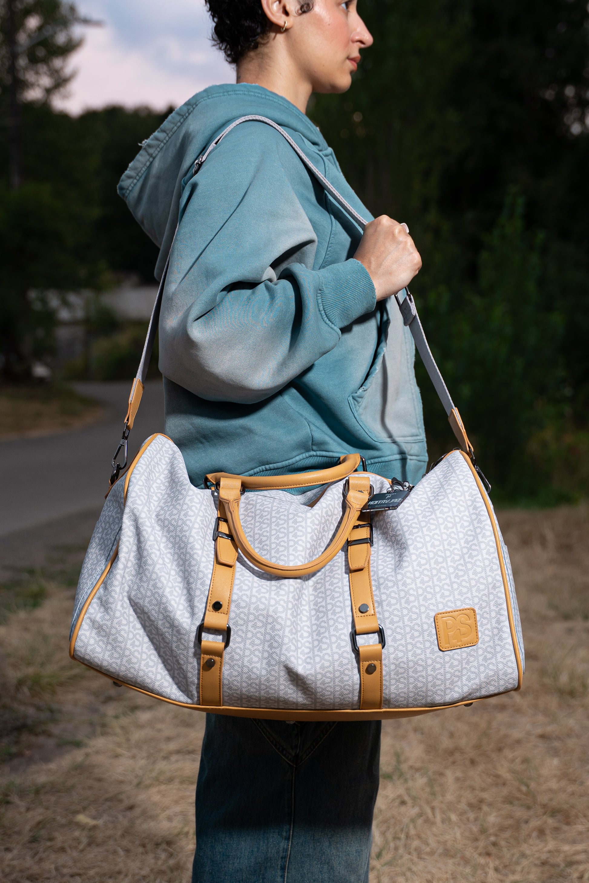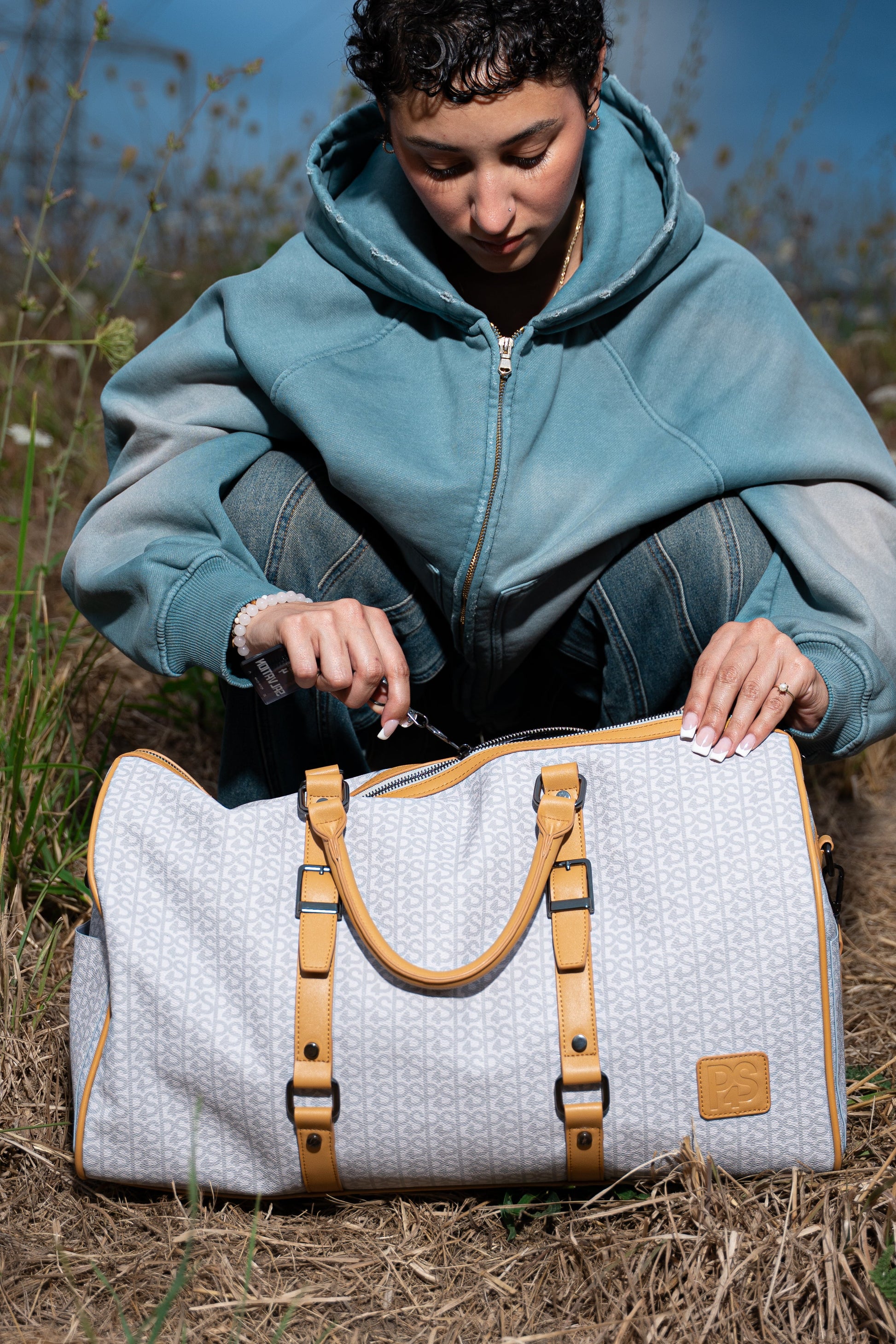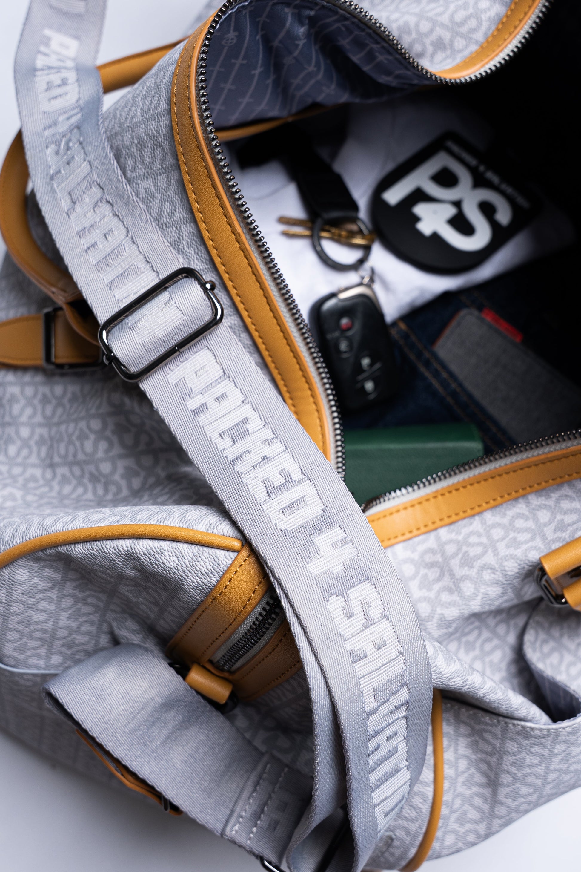 Made from P4S Monogram Printed Canvas with premium leather accents, it offers durability, elegance, and thoughtful organization for all your essentials. This bag symbolizes purpose-driven travel with multiple compartments, a waterproof zippered closure, and faith-based patches.