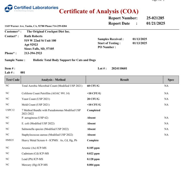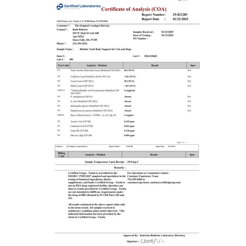 Holistic Total Body Support formulated by Dr. Ruth Roberts is a daily multivitamin for dogs and cats, designed to complement a variety of feeding routines—including home-cooked diet. This powdered blend provides a wide range of essential vitamins, minerals, amino acids, and organ-based ingredients (known as glandular supplement), including calcium citrate for dogs and cats as part of its balanced formula.