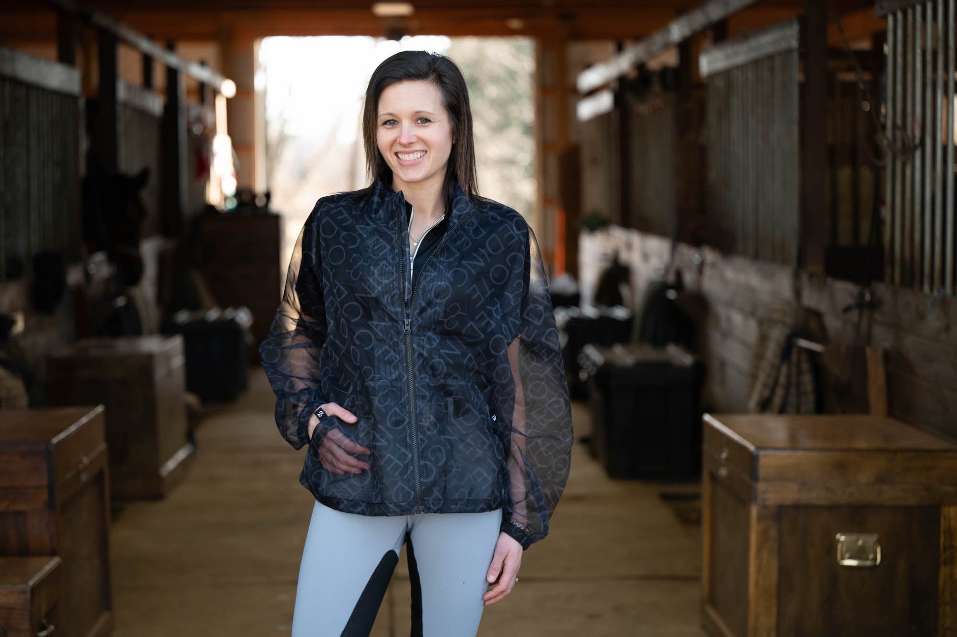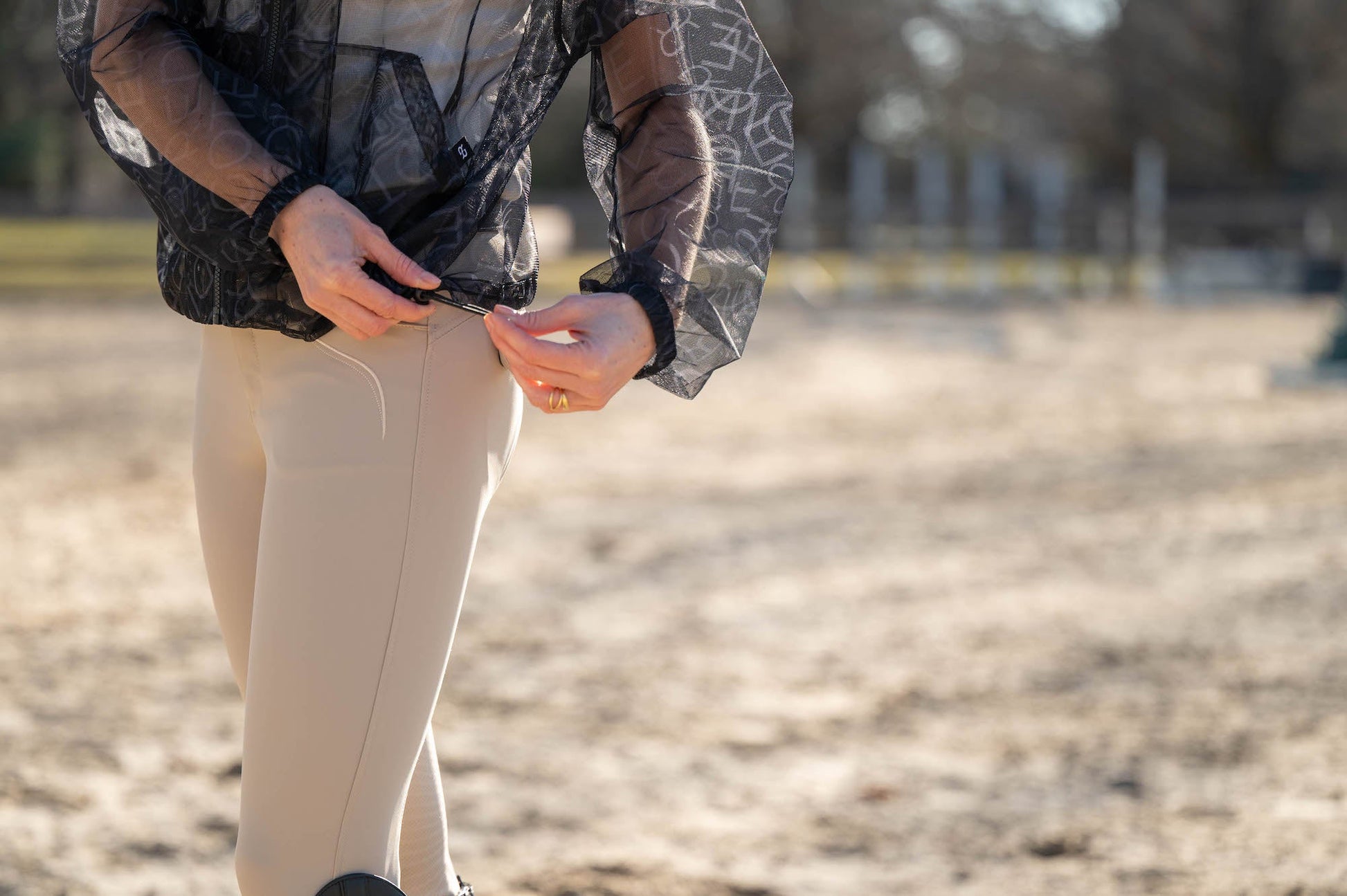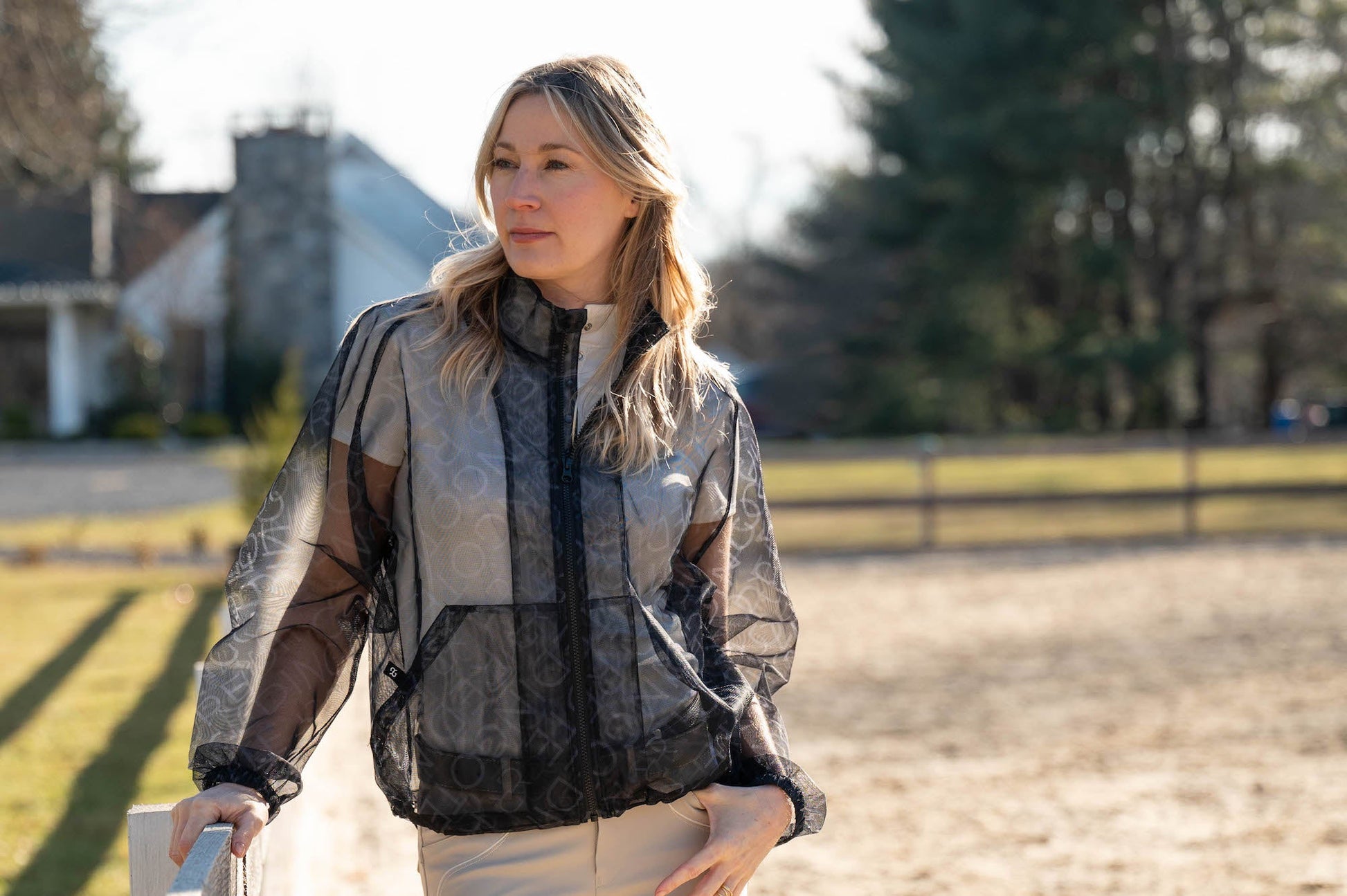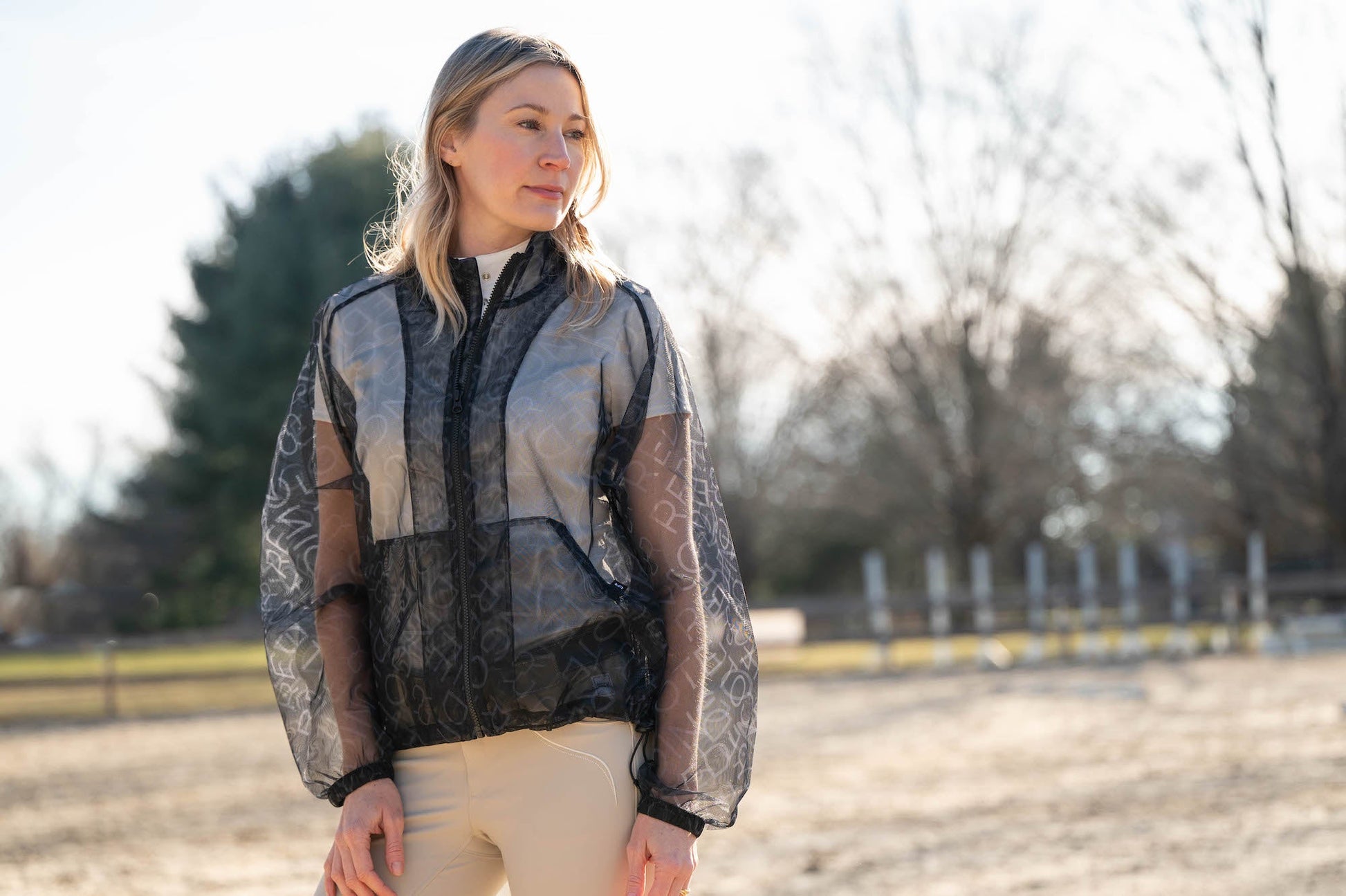 The Redingote Summer Scrim is your barely-there barrier against barnyard bugs, designed to keep you cool and comfortable all season long. Made from breathable sheer mesh in our subtle REDINGOTE logo print, it features a high neckline, zip front, and adjustable drawstring waist for a custom fit. Light, airy, and practical — you’ll forget you’re wearing it, but the bugs won’t.