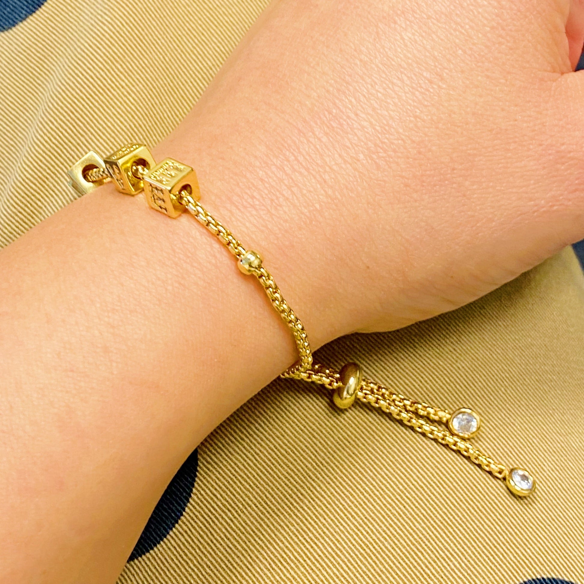 Rolling dice charms put together in positive words. Each dice has shiny paved letters all around and it rolls around on the chain. Easy to adjust with sliding chain with CZ balls at the ends.