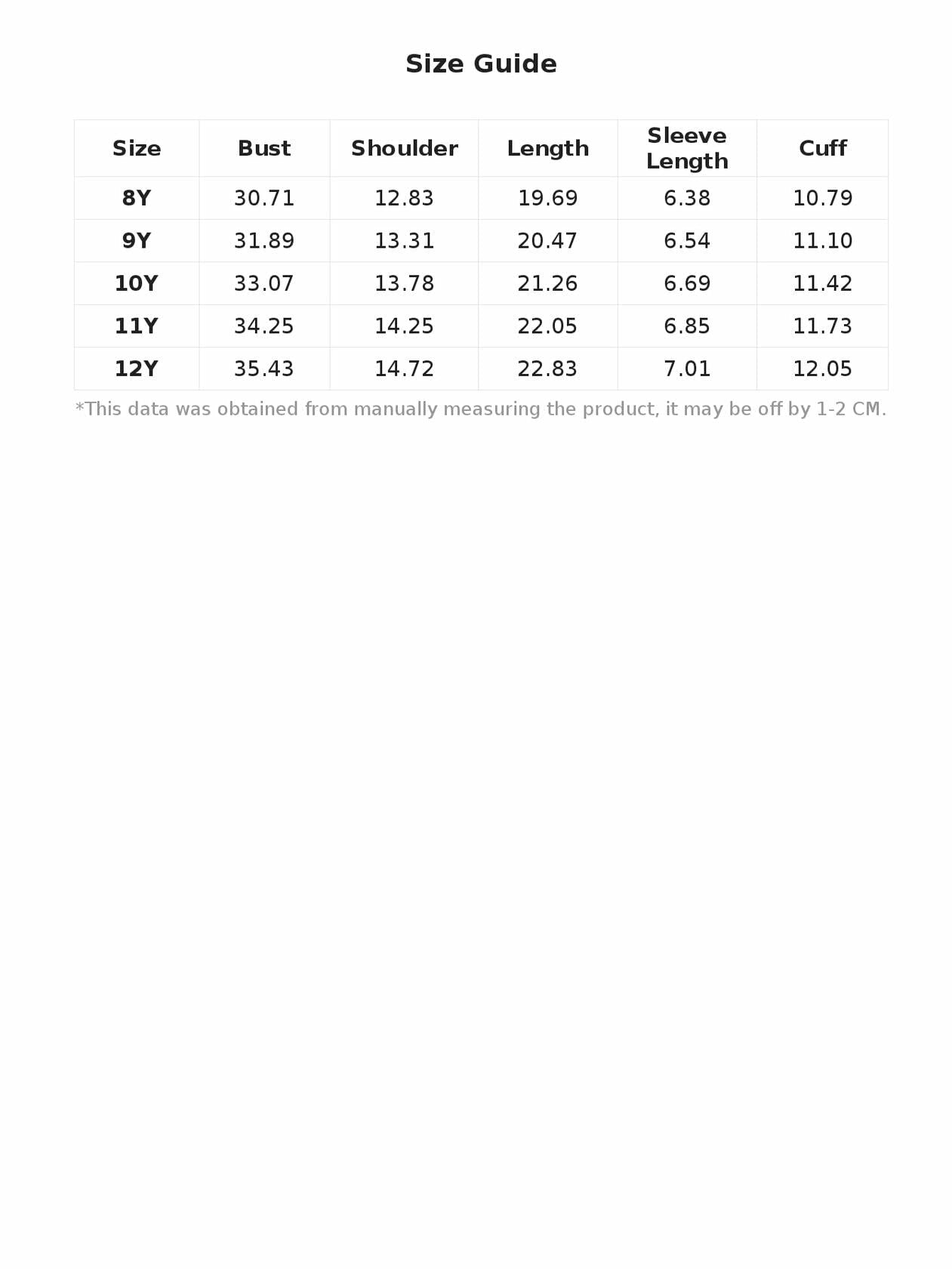 8Y:Sleeve Length:6.4IN,Cuff:10.8IN,Bust:30.7IN,Shoulder:12.8IN,Length:19.7IN
