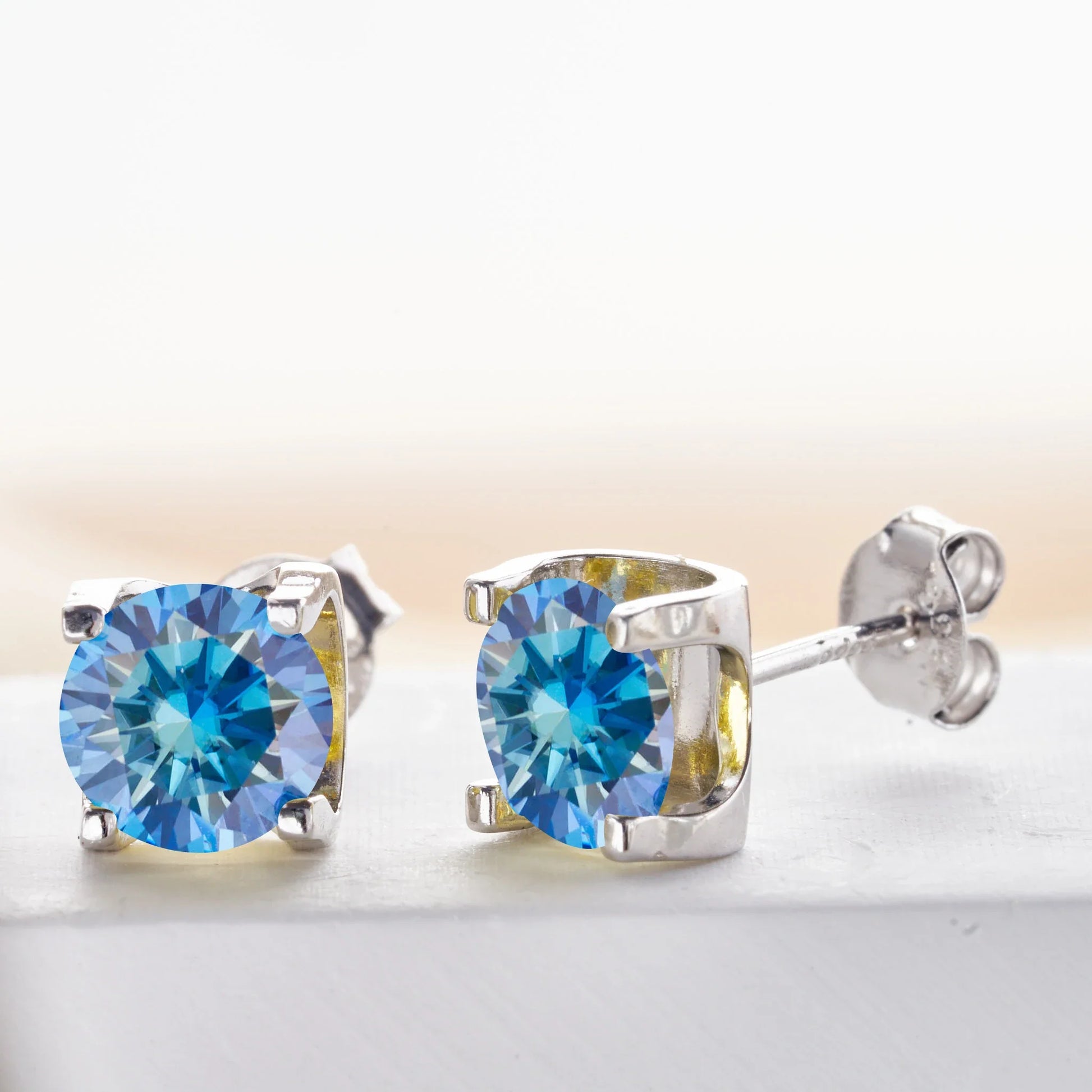 Royal Blue Moissanite Stud Earrings 2ct Total D VVS 925 Sterling Silver