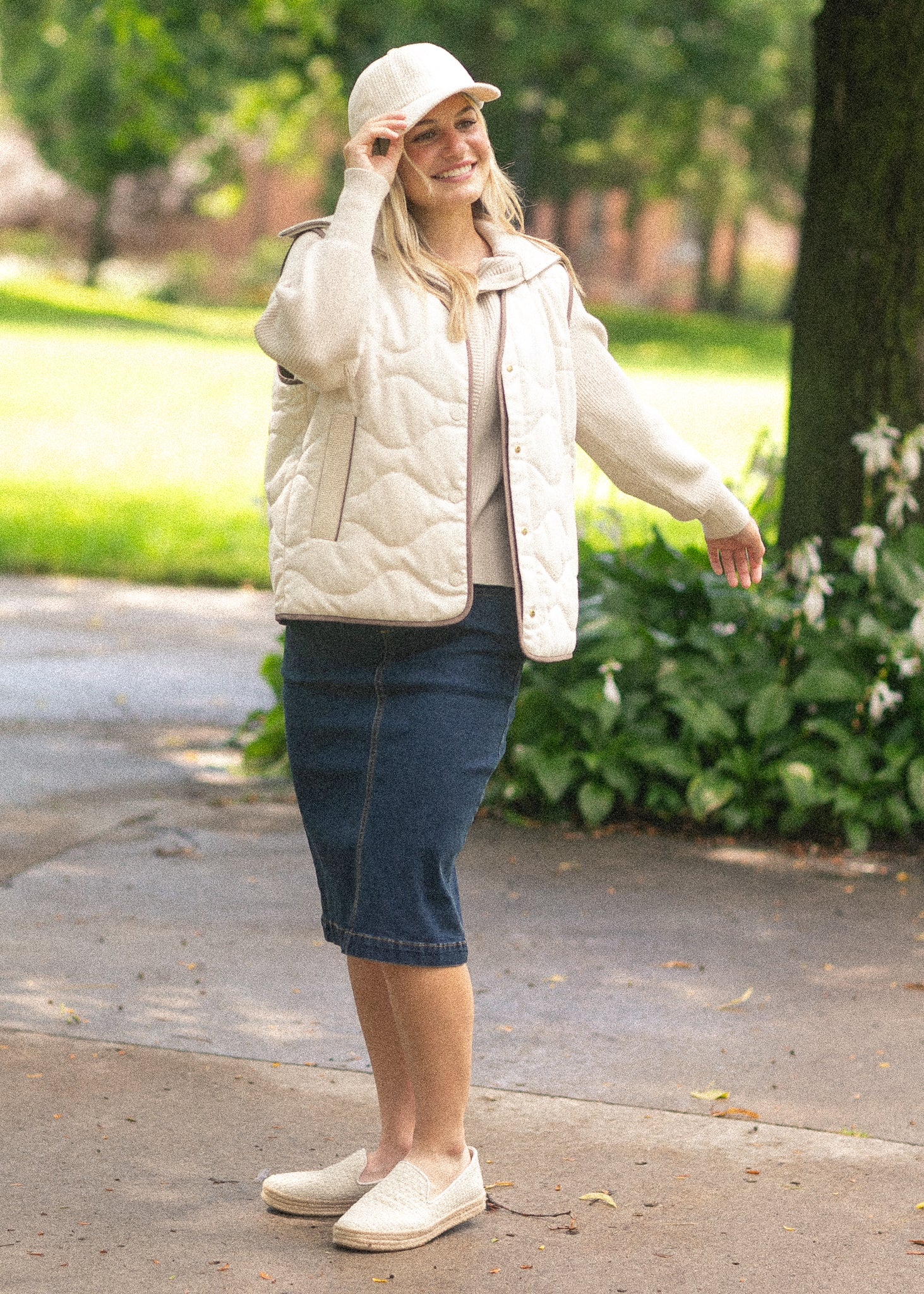 The Sandra Midi Denim Skirt is an Inherit exclusive and a fresh take on our beloved Donna skirt! Made from light wash stretch denim with a pull-on waistband, it offers a flattering, bulk-free fit. A subtle back slit adds ease of movement, while functional pockets and modest length make this the everyday go-to your wardrobe needs!