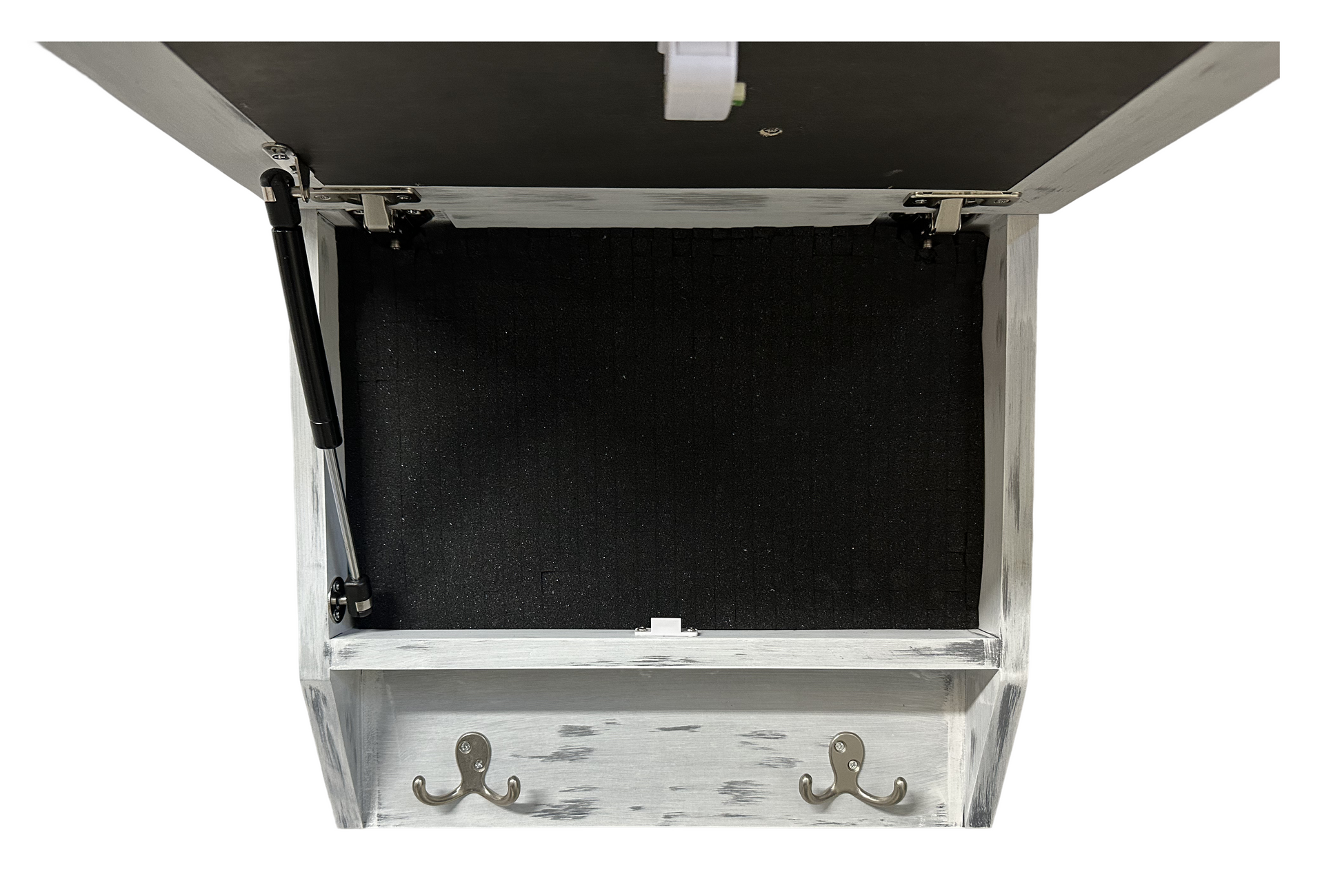 Securely store your firearm in the Snowcapped Mountain Scene Wall-Mounted Gun Cabinet. Featuring a striking layered depiction of snow-covered peaks and dense pine forests, this beautifully distressed cabinet offers both function and aesthetic appeal. The hidden magnetic lock provides quick and secure access to your firearm when needed, ensuring you're prepared without compromising safety or style. With its crisp whitewashed finish and rustic mountain design, it blends seamlessly into farmhouse, lodge, or modern rustic interiors—disguising your firearm storage as a work of wall art.