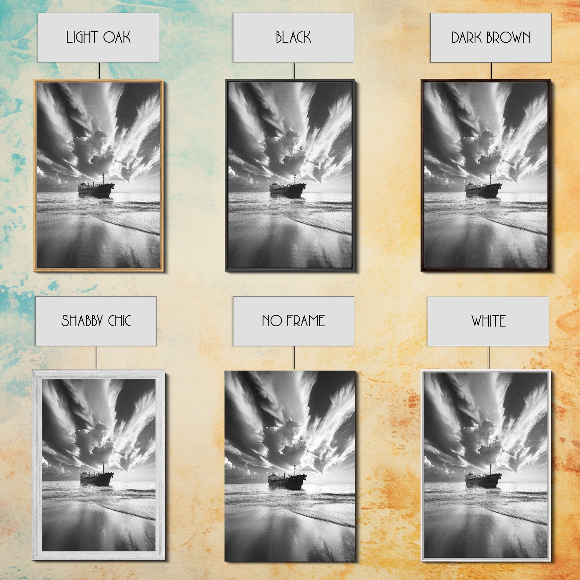 Stormy Sky Ship, Dramatic Seascape, Black White Photography, Ocean Nautical Decor, Framed Canvas Print, Coastal Wall Art, Moody Minimalist