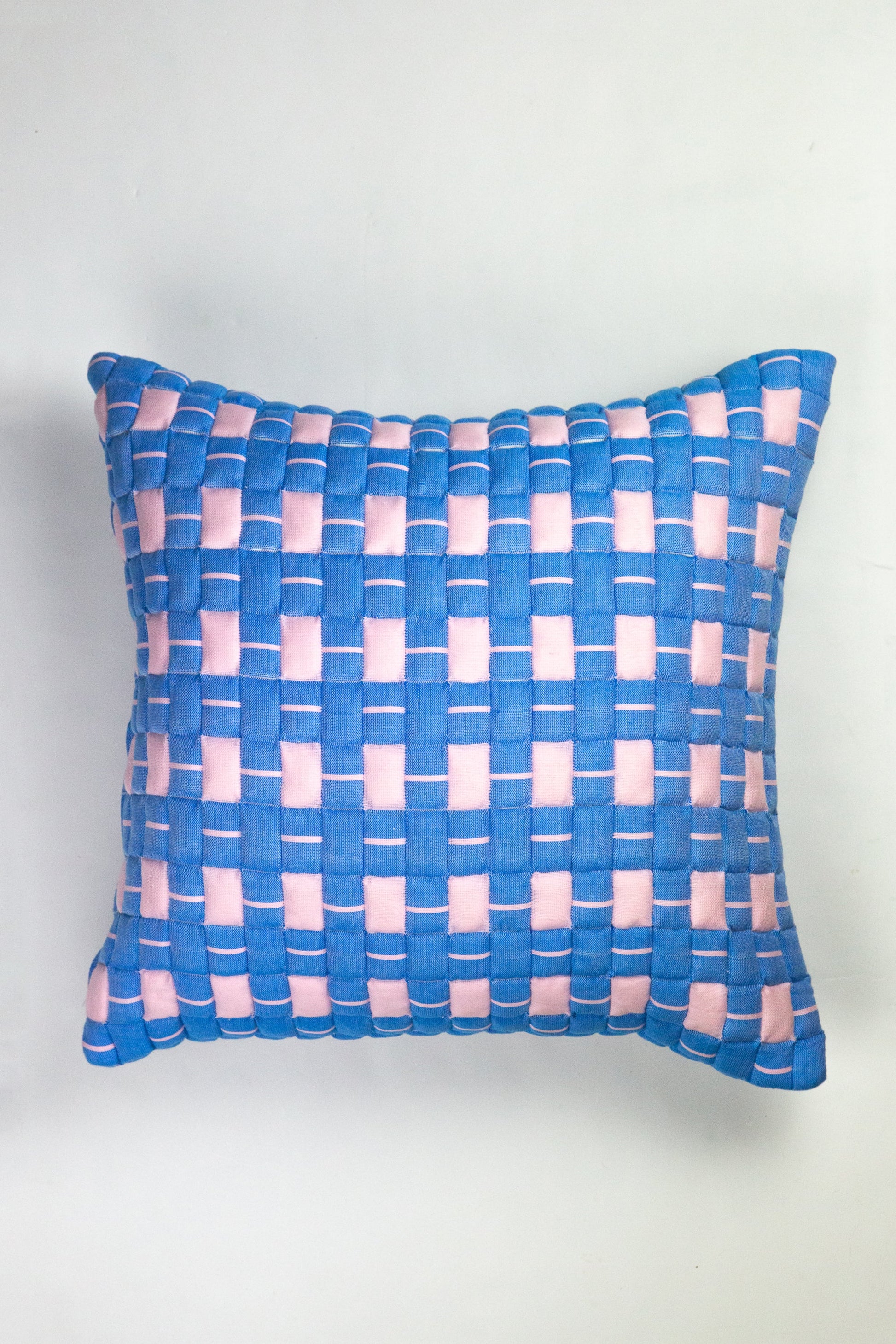 Each square is hand stuffed with cotton batting as its woven. Same fabric on both sides of pillow. Pease inquire if you'd like a different size. Poly-cotton blend.