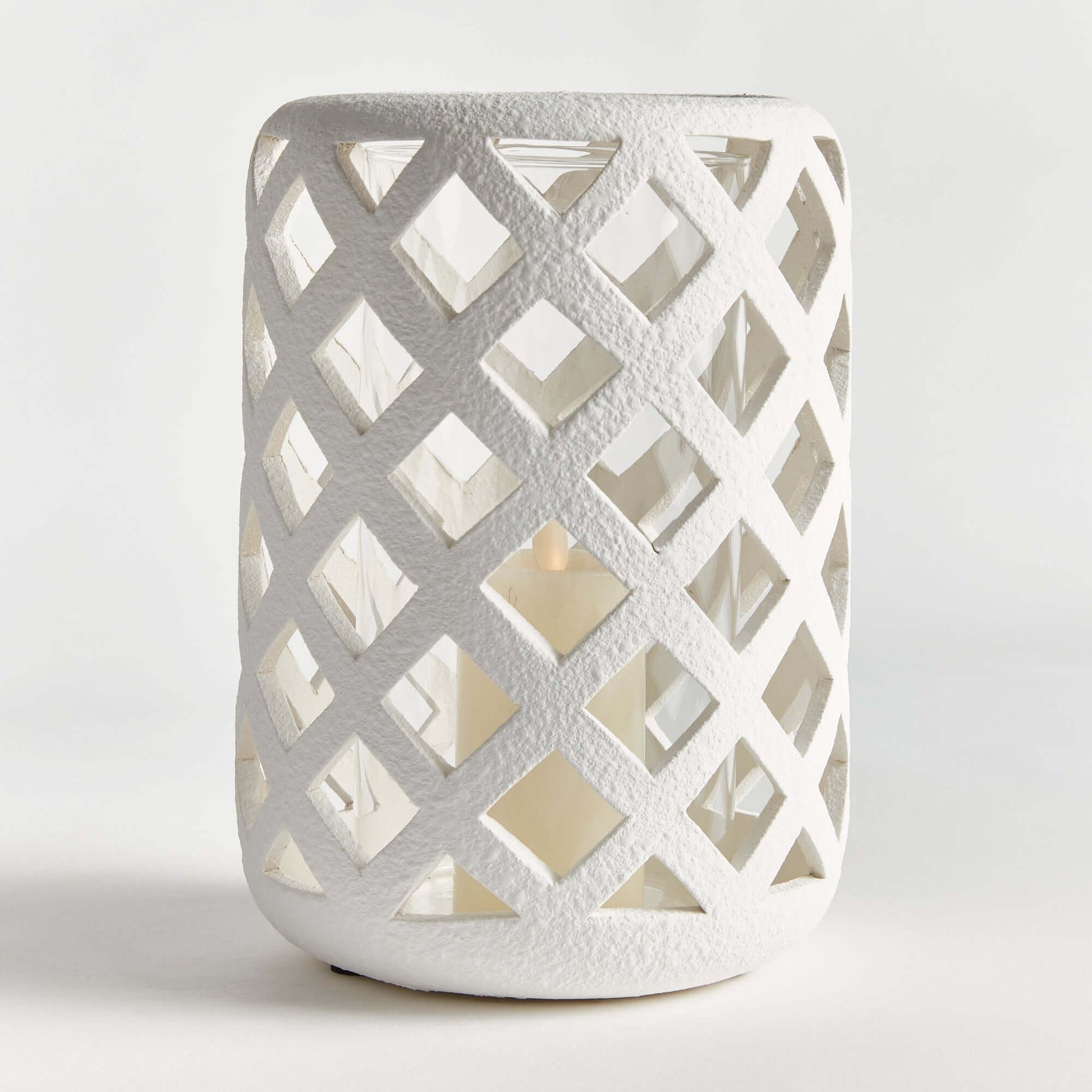 This terracotta hurricane candle holder with glass insert captures the quiet beauty of hand-crafted tradition and timeworn elegance. Formed from hand-cut ceramic strips and shaped into an airy lattice design, it casts soft, flickering shadows that echo the charm of vintage lanterns and garden courtyards. Nestled inside is a clear glass insert, designed to hold a tea light or small pillar candle — letting the glow shine gently through every opening.