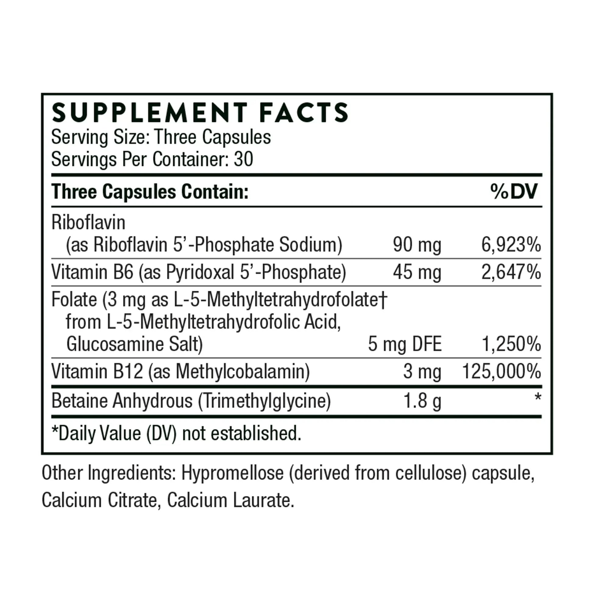 Three Capsules Contain: Riboflavin (as Riboflavin 5'-Phosphate Sodium) 90 mg, Vitamin B6 (as Pyridoxal 5'-Phosphate) 45 mg, Folate (3 mg as L-5-Methyltetrahydrofolate from L-5-Methyltetrahydrofolic Acid, Glucosamine Salt) 5 mg DFE, Vitamin B12 (as Methylcobalamin) 3 mg, Betaine Anhydrous (Trimethylglycine) 1.8 g Other Ingredients: Hypromellose (derived from cellulose) capsule, Calcium Citrate, Calcium Laurate.