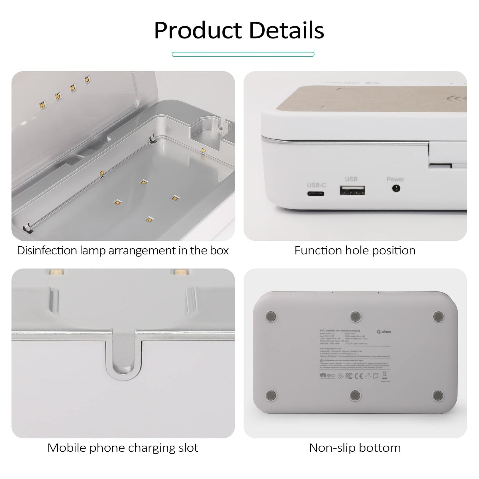 ALNEC by VCUTECH UVC Sanitizer Box with Wireless: Simple cleaning device for your cell phone and all kinds of household items. Just place it in and turn on the device. Highlights: 1. Multi-Purpose, Sanitize and storage. 2. Sanitization for any surfaces. Suitable for shavers, nail clippers, eyeglasses, garnishing tools, etc. 3. Auto-Off once it's opened. 4.No chemical residue, mercury-free and ozone-free. About UVC: 1. UVC sanitizing is acknowledged as a professional technology: UVC LED light kills germs and bacteria by destroying DNA & RNA. It's widely used in cupboard sanitizer and sanitize devices in the hospital. 2. Sanitization process visualization: UVC LED sanitize process can be seen under a microscope. 3. Sanitization effect of smell: UVC LED light can reduce smells by decomposing the molecular structure of odor, such as the milky smell of the feeding bottle, the residue of medicine, sour smell of drinkware, etc.