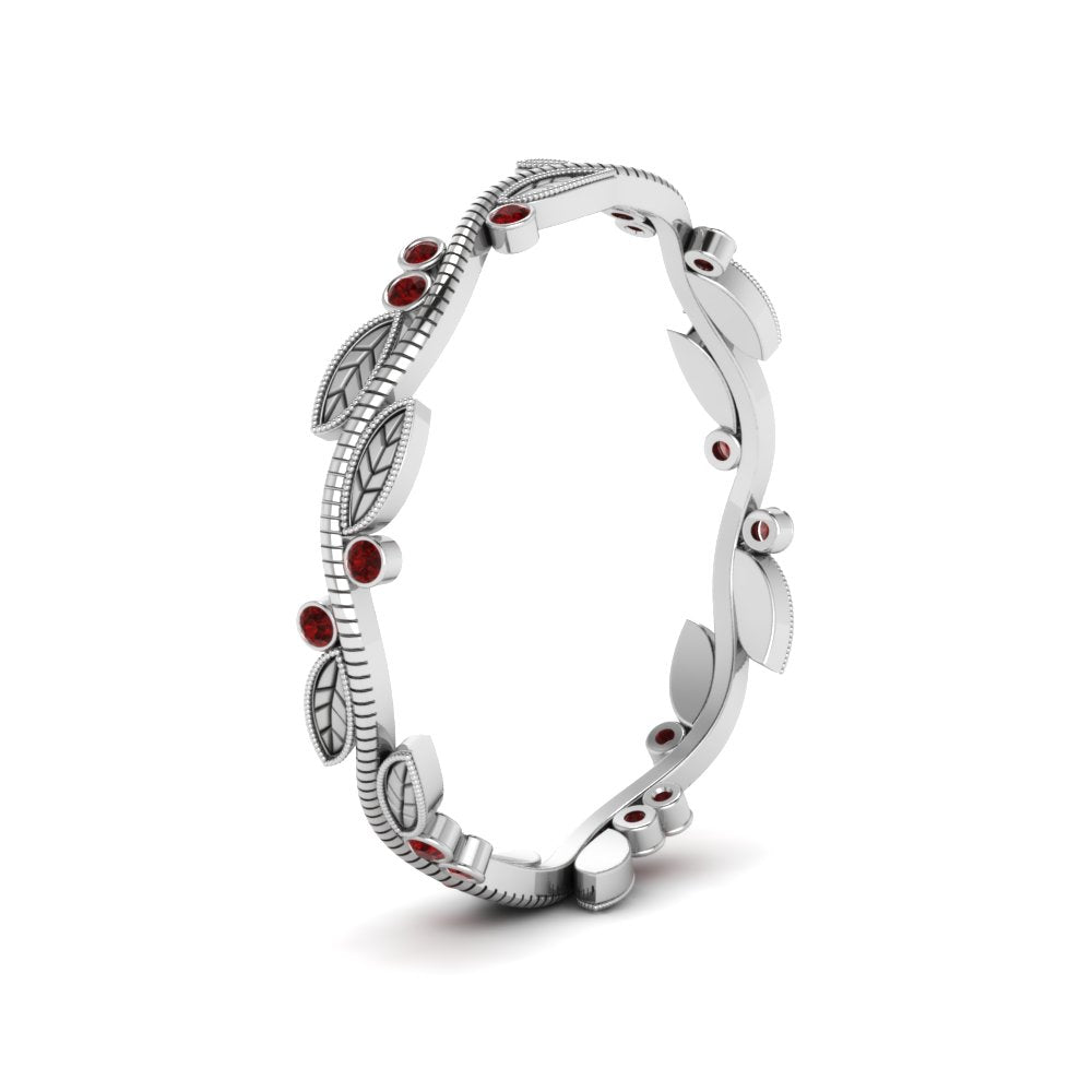 This Vintage Ruby Promise Ring expresses a Nature-Inspired Design with its intricate Detailing of Leaf pattern embedding dazzling Round Cut Reb ruby stones in a Bezel setting which exhibits the true essence of nature beautifully.