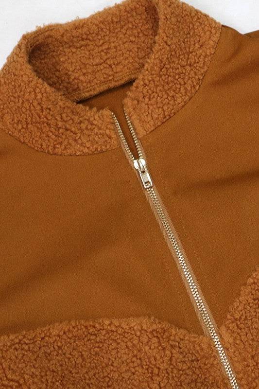 Women's fashion rompers, Front zip closure, long sleeves, side pocket, teddy fuzzy multi-fabric romper