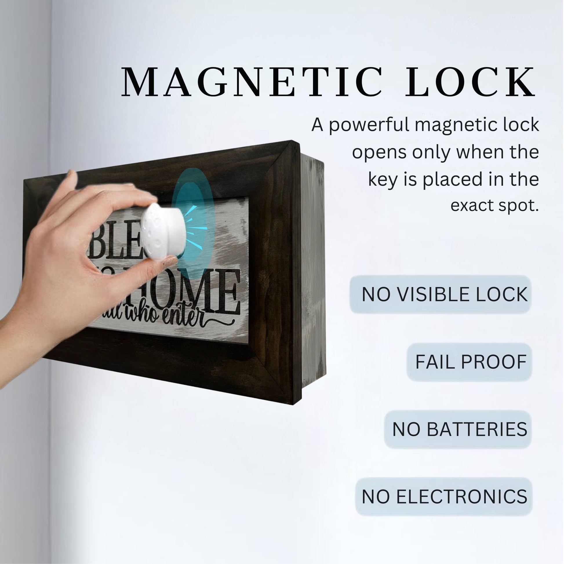 - FAIL PROOF MAGNETIC LOCK: No batteries, no electronics and will always work! Engineered for reliability and security, our wall gun safe features a powerful magnetic lock—only triggered by a key placed in an exact location. Designed for hidden wall storage, it keeps firearms or valuables out of sight and protected — discreetly stored inside a wall-mounted wood gun cabinet with no visible access point.