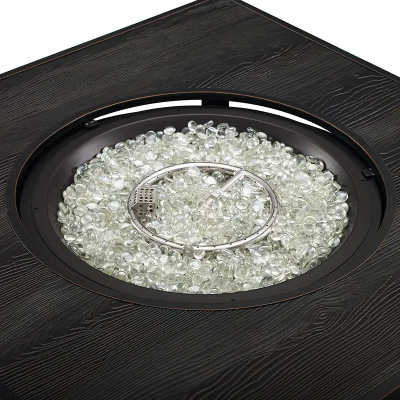 Yorke 40" Square Aluminum Convertible Gas Fire Pit Table: Compatible with any contemporary or traditional outdoor décor, the Yorke Aluminum LPG Fire Pit features a woodgrain-and-beadboard motif with a round base. With an Antique Bronze brushed finish, practical aluminum build, and an output of 55,000 BTUs, this versatile fire pit pulls double duty as a patio table when you add the included fire bowl lid with flush-mounted handle. Arriving with clear fire glass for a stylish touch, just add a standard 20 lb propane tank behind the convenient hinged door. A nylon cover for the fire pit is included for your convenience.